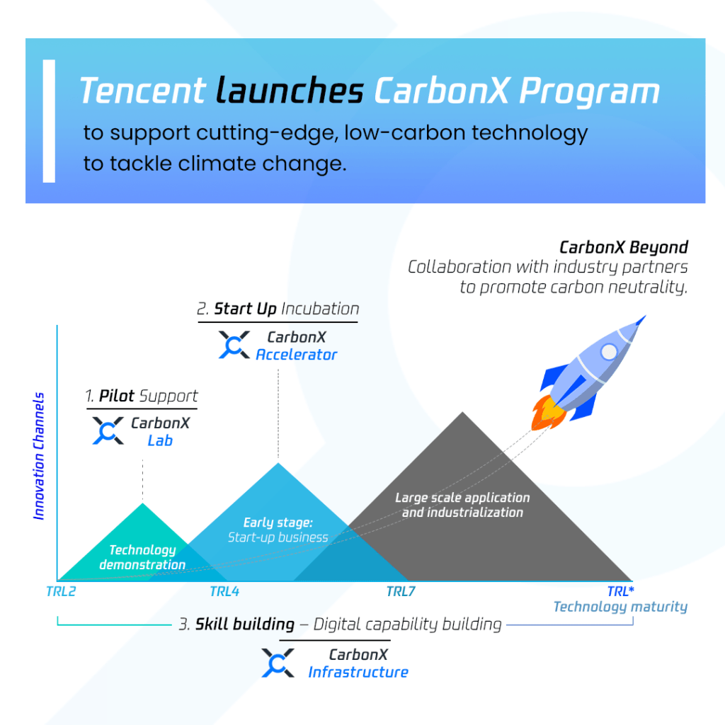 ดังนั้น เทนเซ็นต์ จึงเปิดตัวโครงการแฟล็กชิพ “คาร์บอนเอ็กซ์” (CarbonX Program) เมื่อเดือนมีนาคมที่ผ่านมา เพื่อส่งเสริมการพัฒนาเทคโนโลยีคาร์บอนต่ำแห่งอนาคต รวมถึงส่งเสริมการนำเทคโนโลยีล้ำสมัยต่าง ๆ ไปประยุกต์ใช้งานในสเกลระดับใหญ่ภายในปี 2030 โดยในระยะแรกของโครงการฯ จะให้ความสำคัญกับเทคโนโลยี CCUS