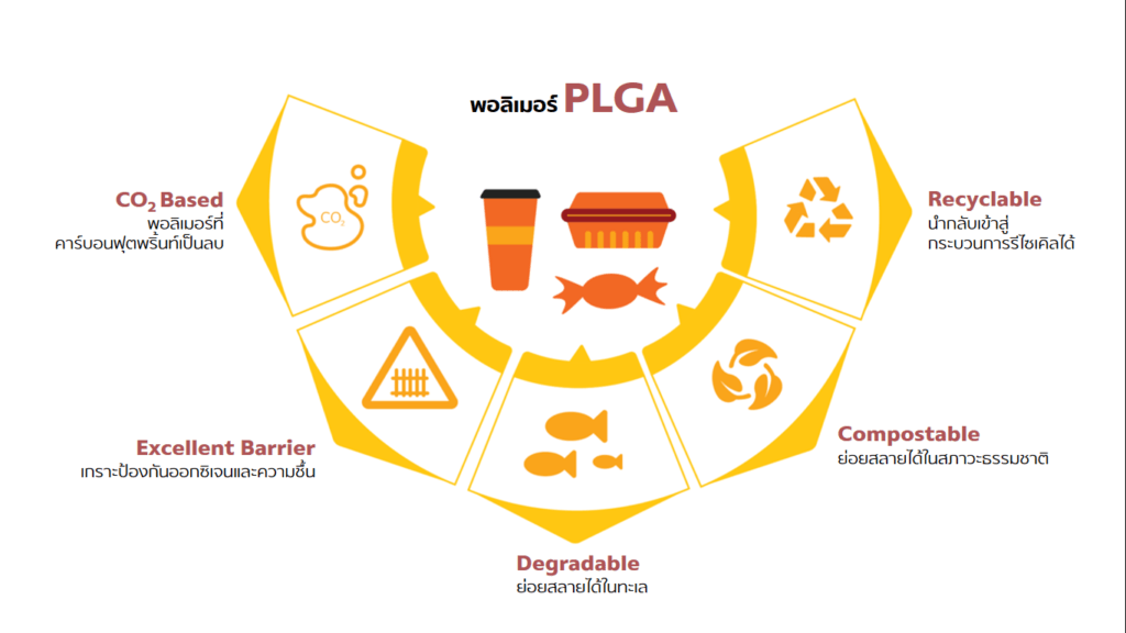 ซึ่งล่าสุด SCGC ได้ร่วมกับ Avantium พัฒนาพอลิเมอร์ PLGA (polylactic-co-glycolic acid: PLGA)  หรือ พอลิเมอร์คาร์บอนฟุตพริ้นท์เป็นลบ (carbon-negative plastic)  โดยนำเอาก๊าซคาร์บอนไดออกไซด์มาใช้เป็นสารตั้งต้น รวมทั้งไม่ปล่อยก๊าซคาร์บอนฯ ในกระบวนการผลิต นอกจากนี้ ยังพบว่า พอลิเมอร์ PLGA ซึ่งมีส่วนผสมของกรดแลคติกและไกลโคลิค นอกจากจะมีประสิทธิภาพที่ดีมีคุณสมบัติพิเศษในการป้องกันออกซิเจน ความชื้น และรีไซเคิลได้นั้น ยังสามารถย่อยสลายได้ทั้งในสภาวะธรรมชาติ  และในทะเลอีกด้วย ซึ่งตอบโจทย์ทั้งภาคอุตสาหกรรมและการดูแลสิ่งแวดล้อมอย่างยั่งยืน”