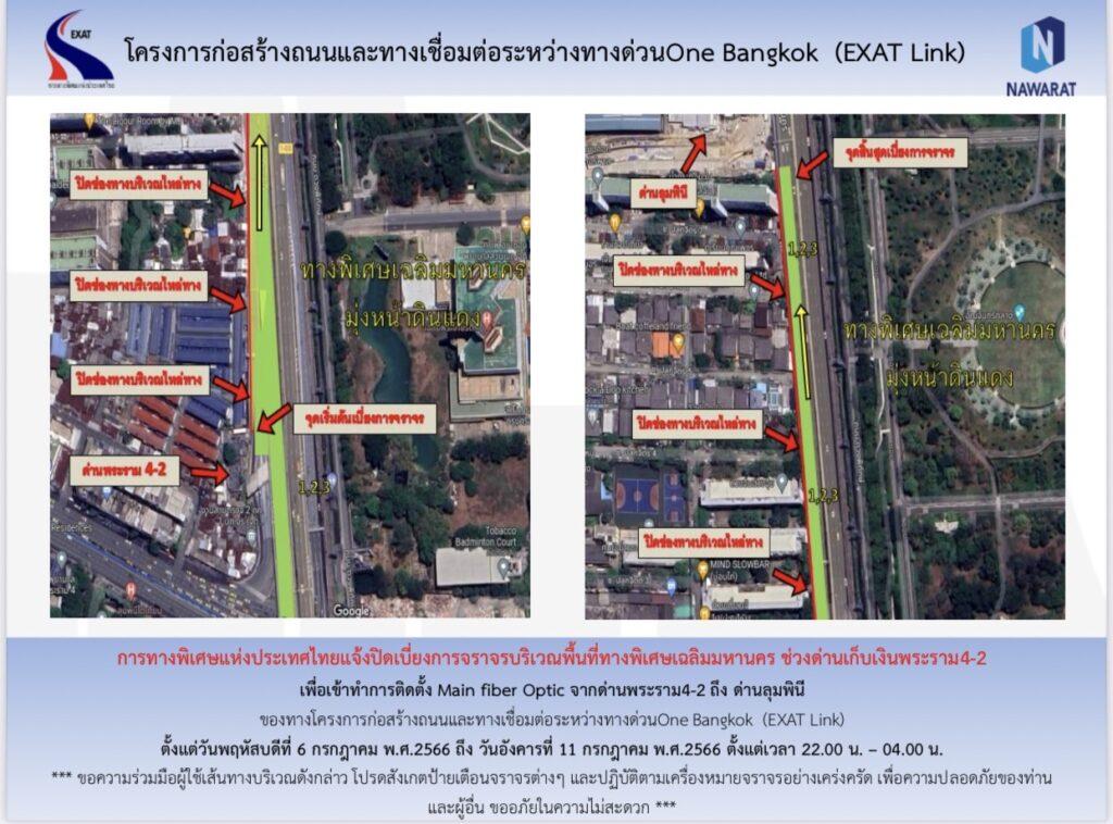 การทางพิเศษแห่งประเทศไทย (กทพ.) กระทรวงคมนาคมได้ร่วมมือกับ บริษัท วัน แบงค็อก จำกัด โดยได้ว่าจ้างบริษัท เนาวรัตน์พัฒนาการ จำกัด (มหาชน) เป็นผู้ดําเนินการก่อสร้างโครงการก่อสร้างถนนและทางเชื่อมต่อระหว่างทางด่วน One Bangkok (Exat Link) ขอแจ้งปิดเบี่ยงการจราจรชั่วคราว บนไหล่ทางของทางพิเศษเฉลิมมหานคร (ขาเข้า) จากด่านพระราม 4-2 ถึงด่านลุมพินี เพื่อติดตั้งท่อร้อยสาย Main Fiber Optic ตั้งแต่วันที่ 6 กรกฎาคม 2566 ถึง 11 กรกฎาคม 2566 ช่วงเวลาตั้งแต่เวลา 22.00 น. – 04.00 น.