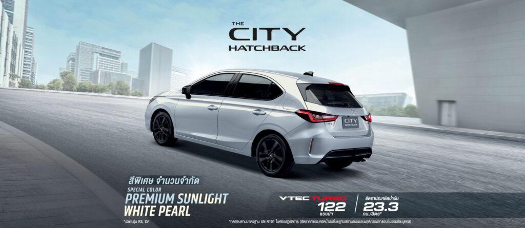 บริษัท ฮอนด้า ออโตโมบิล (ประเทศไทย) จำกัด แนะนำ ฮอนด้า ซิตี้ แฮทช์แบ็ก สีใหม่ สีขาวพรีเมียมซันไลท์ (มุก) (Premium Sunlight White Pearl) จำนวนจำกัด เฉพาะรุ่น RS และ SV นำเสนอสีสันใหม่ให้ลูกค้าได้มูฟอย่างมีสไตล์ไปกับซิตี้คาร์สปอร์ตแฮทช์แบ็ก 5 ประตูยอดนิยม ด้วยดีไซน์ภายนอกที่โดดเด่นสไตล์สปอร์ต และเสริมความสปอร์ตแบบเอกซ์คลูซีฟรอบคันในรุ่น RS ภายในกว้างขวาง ผสานเอกลักษณ์ความอเนกประสงค์กับเบาะนั่ง อัลตราซีท (ULTR Seat) ที่สามารถปรับพับเพื่อเปลี่ยนพื้นที่ใช้สอยได้หลากหลายรูปแบบการใช้งาน ขับสนุกอัตราเร่งเร้าใจไปกับขุมพลัง VTEC TURBO 1.0 ลิตร ที่มอบกำลังสูงสุด 122 แรงม้า ที่ 5,500 รอบต่อนาที แรงบิดสูงสุด 173 นิวตัน-เมตร ตั้งแต่ 2,000 – 4,500 รอบต่อนาที และประหยัดน้ำมันดีเยี่ยมถึง 23.3 กิโลเมตร/ลิตร ครบครันด้วยฟังก์ชันเพื่อความสะดวกสบายและความปลอดภัยอื่น ๆ ที่ตอบโจทย์ทุกไลฟ์สไตล์ โดยมาพร้อมข้อเสนอพิเศษ* ดอกเบี้ย 1.85% พร้อมฟรีประกันภัย 1 ปี และรับเพิ่มฟรีโปรแกรมการให้บริการพิเศษด้านคุณภาพรถยนต์ ฮอนด้า อัลติเมท แคร์ (Honda Ultimate Care) ขยายเวลารับประกันคุณภาพอีก 2 ปี หรือ 40,000 กิโลเมตรโดย ฮอนด้า ซิตี้ แฮทช์แบ็ก สีใหม่ สีขาวพรีเมียมซันไลท์ (มุก) จะเปิดจองและจำหน่ายตั้งแต่วันที่ 14 กรกฎาคม 2566  ซึ่งจะพร้อมส่งมอบตั้งแต่วันที่ 18 สิงหาคม 2566 เป็นต้นไป ที่โชว์รูมฮอนด้าทั่วประเทศ ในจำนวนจำกัดและมีให้เลือกเพียง 2 รุ่นย่อย ได้แก่