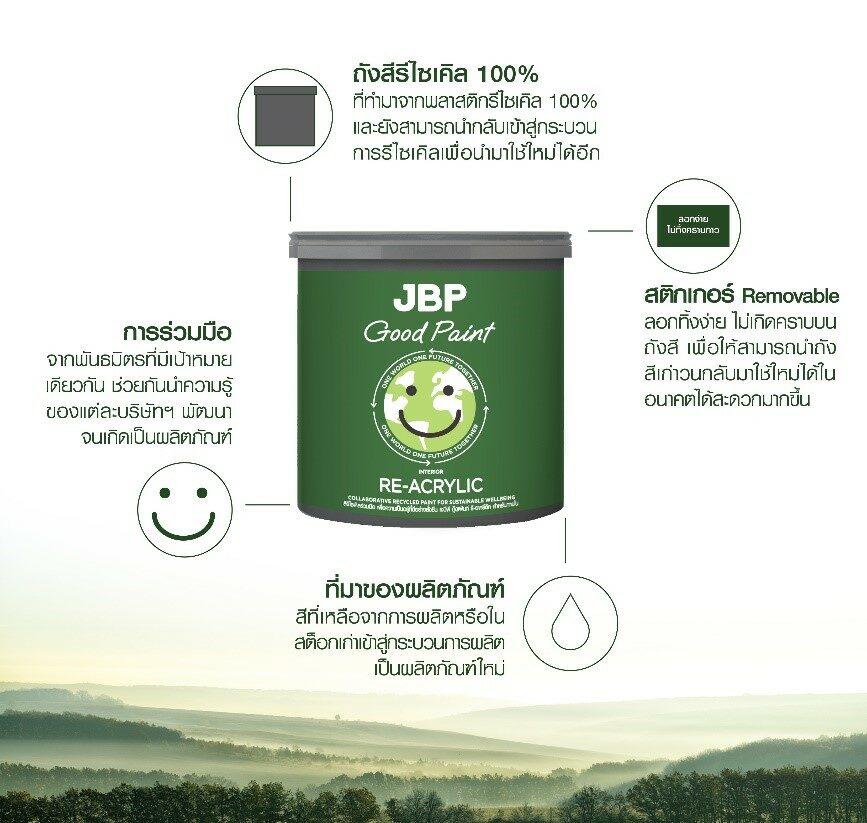 ไทวัสดุ ผู้นำธุรกิจค้าปลีกวัสดุก่อสร้างและสินค้าตกแต่งบ้าน ภายใต้ บริษัท ซีอาร์ซี ไทวัสดุ จำกัด ในเครือเซ็นทรัล รีเทล เดินหน้าผลักดันกลุ่มสินค้ารักษ์โลก กับผลิตภัณฑ์ไฮไลต์ “JBP Good Paint Re-Acrylic” ครั้งแรกของสีทาอาคารรีไซเคิลในประเทศไทย พร้อมส่งดีลสุดคุ้มเอาใจคนรักบ้านสายกรีน เมื่อซื้อผลิตภัณฑ์ JBP Good Paint Re-Acrylic ขนาด 2.5 แกลลอน รับส่วนลดพิเศษท้ายบิล 100 บาท/ถัง ตั้งแต่วันนี้ – 31 สิงหาคม นี้ ที่ไทวัสดุทุกสาขา
