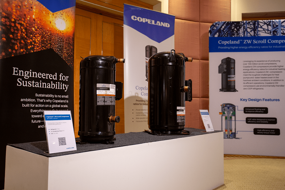 คอมเพรสเซอร์เป็นส่วนประกอบสำคัญของปั๊มความร้อน ภายในงาน Copeland จึงได้นำเสนอผลิตภัณฑ์คอมเพรสเซอร์รุ่นต่างๆ อาทิ คอมเพรสเซอร์สโครลดิจิทัล รุ่น ZWD และคอมเพรสเซอร์สโครลอุณหภูมิสูง รุ่น ZW บริษัทฯ ได้พัฒนาคอมเพรสเซอร์ให้สามารถผลิตน้ำร้อนหรือลมร้อนได้ในอุณหภูมิที่สูงมากถึง 135 องศาเซลเซียส เพื่อรองรับการใช้งานในภาคอุตสาหกรรม และมีความโดดเด่นในเรื่องการประหยัดพลังงาน เมื่อเทียบกับการใช้เครื่องทำความร้อน และหม้อต้มไฟฟ้า (Electric Heater and Boiler) ทั่วไป อีกทั้งยังลดการปล่อยก๊าซคาร์บอนไดออกไซด์สู่ชั้นบรรยากาศ ซึ่งเป็นสาเหตุของภาวะโลกร้อนอีกด้วย