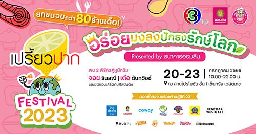 เริ่มแล้ว! เทศกาลความอร่อยที่ห้ามพลาด เปรี้ยวปาก Festival 2023 อร่อยมงลง ปักธงรักษ์โลก By ธนาคารออมสิน” จัดโดยรายการเปรี้ยวปาก รายการวาไรตี้กิน-เที่ยว ออกอากาศทางช่อง 3HD (ช่อง 33) นำโดย 2 พิธีกรคู่หูสายกิน “เต๋อ-ฉันทวิชช์ ธนะเสวี และจอย-รินลณี ศรีเพ็ญ” พร้อมทัพดาราดังคับคั่ง ชวนเหล่านักชิมทั่วกรุงมาลิ้มรสความอร่อยเกินต้านในที่เดียว วันที่ 20-23 กรกฎาคม 2566 เวลา 10.00 – 22.00 น. ณ ลานโปรโมชั่น ชั้น 1 ศูนย์การค้าเซ็นทรัล เวสต์เกต