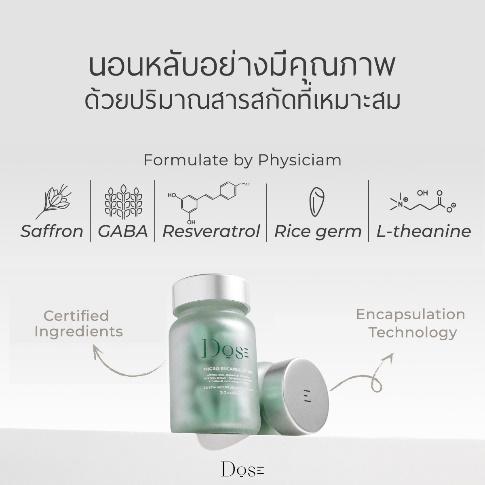 DOSE เน้นการสร้างเสริมการนอนด้วยสารสกัดที่มีส่วนช่วยให้ร่างกายผ่อนคลาย โดยแบ่งสารสกัดหลักๆ ออกเป็น 3 กลุ่ม ด้วยกัน กลุ่มแรก ช่วยส่งเสริมทางด้านสมอง ด้านการปรับคลื่นสมอง ช่วยให้ร่างกายรู้สึกผ่อนคลาย สงบ เพื่อเพิ่มสมาธิ และส่งผลให้ความทรงจำดีขึ้น (L-Theanine, Gaba, Lemon Balm, Chamomile, CBD, Saffron) กลุ่มที่สอง ช่วยปรับเรื่องคุณภาพการนอน ระยะเวลาในการนอน (Tart Cherry, Magnesium) และกลุ่มที่สาม ช่วยฟื้นฟูร่างกายขณะนอนหลับ (Resveratrol, Rice Germ, L-Glutamine, Ascorbic Acid, B Complex) จุดเด่นของไนท์ ไทม์ โดส จะช่วยเพิ่มคุณภาพการนอน และช่วยซ่อมแซมร่างกายขณะพักผ่อน เป็นกลไกหลักที่มาพร้อมนวัตกรรม Encapsulation ช่วยให้ร่างกายดูดซึมสารสกัดได้ดีขึ้น โดย DOSE ให้ความสำคัญกับการใส่สารสกัดในปริมาณที่เหมาะสมกับร่างกาย ไม่มากหรือน้อยไป แต่พอเหมาะกับที่ร่างกายควรจะได้รับ เพื่อให้ร่างกายดูดซึมไปใช้ได้อย่างมีประสิทธิภาพสูงสุด