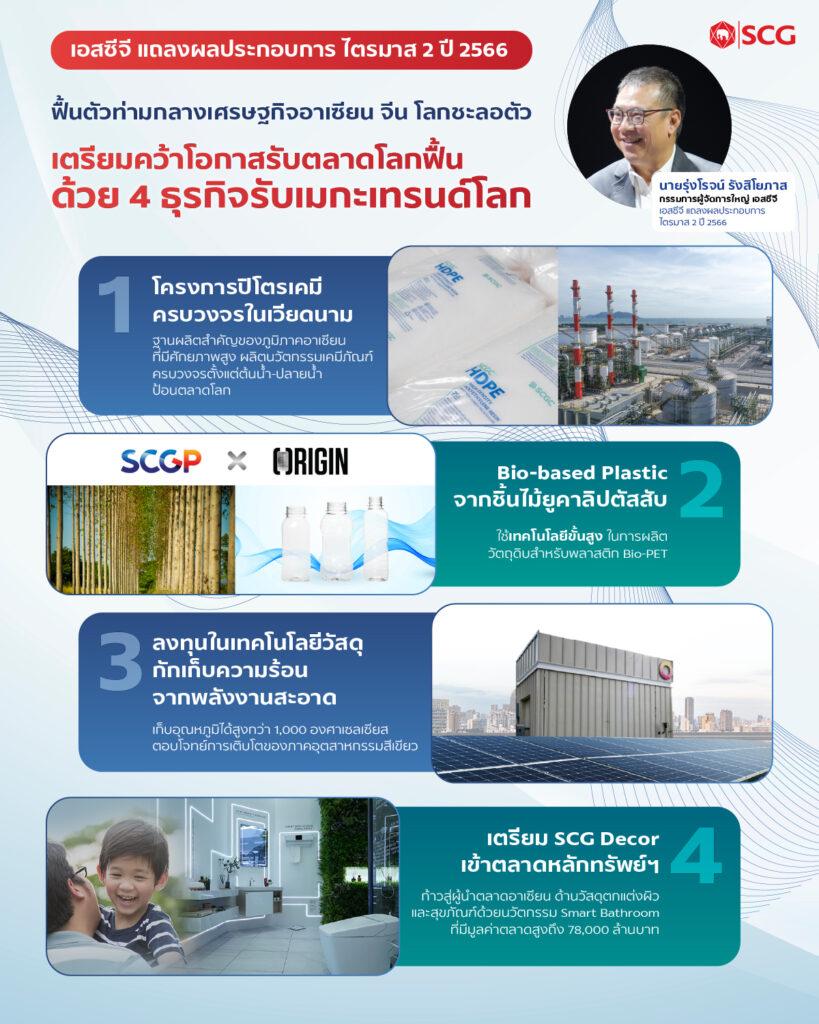มีรายได้ 124,631 ล้านบาท  กำไรสำหรับงวด 8,082 ล้านบาท  กำไรจากการดำเนินงาน 5,216 ล้านบาท  เพิ่มขึ้นร้อยละ 14 เมื่อเทียบกับไตรมาสก่อน  จากปริมาณการขายสินค้าพอลิโอเลฟินส์เพิ่มขึ้นในธุรกิจเคมิคอลส์ และต้นทุนพลังงานที่ลดลง เอสซีจี เตรียมคว้าโอกาสตลาดโลกฟื้นด้วยการเร่งเครื่อง 4 ธุรกิจตอบเมกะเทรนด์โลก  ได้แก่  1. โครงการปิโตรเคมีครบวงจรใหญ่สุดในเวียดนาม ฐานผลิตสำคัญของภูมิภาคอาเซียนที่มีศักยภาพสูง ผลิตนวัตกรรมเคมีภัณฑ์ครบวงจรตั้งแต่ต้นน้ำ-ปลายน้ำ  ป้อนตลาดโลก ซึ่งมีฐานลูกค้าอยู่แล้ว  2. ผนึกกำลังกับคู่ธุรกิจชั้นนำระดับโลกด้านนวัตกรรมกรีน ยกระดับ Green Innovation ตอบโจทย์ความต้องการตลาดโลก และสอดคล้องกับเทรนด์ ESG  ได้แก่  นวัตกรรม ‘Biobased Plastic จากชิ้นไม้ยูคาลิปตัสสับ’ โดยใช้เทคโนโลยีขั้นสูงผลิตเป็นวัตถุดิบสำหรับพลาสติก Bio-PET ที่ย่อยสลายได้ 3. ลงทุนในเทคโนโลยีวัสดุกักเก็บความร้อนจากพลังงานสะอาด ที่เก็บอุณหภูมิได้สูงกว่า 1,000 องศาเซลเซียส ซึ่งเป็นส่วนประกอบหลักของแบตเตอรี่ความร้อน ตอบโจทย์การเติบโตของภาคอุตสาหกรรมสีเขียว ตามเป้าหมาย Net Zero   และ 4. เตรียม SCG Decor  เข้าตลาดหลักทรัพย์ฯ ก้าวสู่ผู้นำตลาดอาเซียนด้านวัสดุตกแต่งผิว และสุขภัณฑ์ด้วยนวัตกรรม Smart Bathroom โดยมูลค่าตลาดอาเซียนมีโอกาสโตสูงถึง 78,000 ล้านบาท ในปี 2569