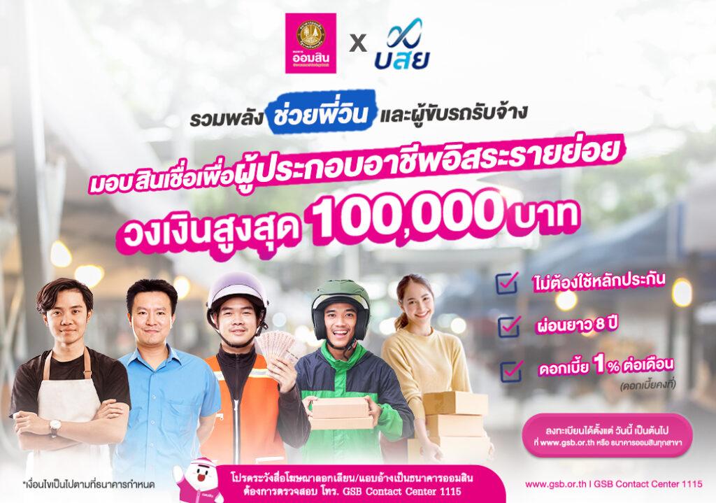 ออมสิน รวมพลัง บสย. เสริมสภาพคล่องพี่วิน ผู้ขับรถรับจ้าง ประกอบอาชีพอิสระออกสินเชื่อเพื่อผู้ประกอบอาชีพอิสระรายย่อย ไม่ต้องมีหลักประกันและบุคคลค้ำให้กู้รายละไม่เกิน 1 แสนบาท ดอกเบี้ยร้อยละ 1 ต่อเดือน เปิดกู้แล้ววันนี้