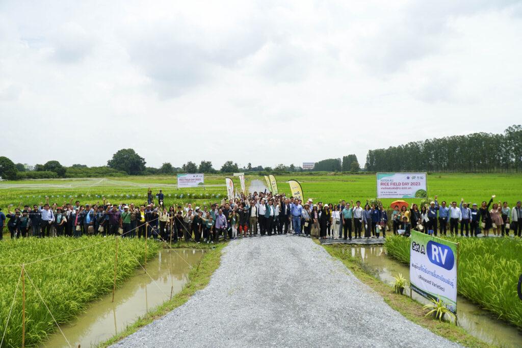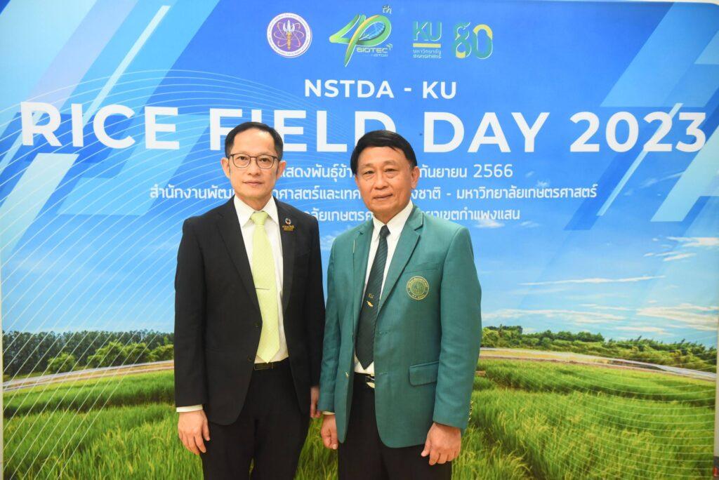 ดร.วรรณพ วิเศษสงวน ผู้อำนวยการศูนย์พันธุวิศวกรรมและเทคโนโลยีชีวภาพแห่งชาติ (ไบโอเทค) สวทช. กล่าวว่า งาน NSTDA-KU Rice Field Day 2023 เป็นครั้งแรกที่หน่วยงานทั้งสองนำสายพันธุ์ข้าวใหม่ๆ ที่เกิดจากการพัฒนาร่วมกันระหว่างมหาวิทยาลัยเกษตรศาสตร์ ไบโอเทค และหน่วยงานต่างๆ เช่น กรมการข้าว มหาวิทยาลัยเทคโนโลยีราชมงคลล้านนา มหาวิทยาลัยอุบลราชธานี โดยได้รับการสนับสนุนงบประมาณจากแหล่งทุนต่างๆ ทั้งในประเทศ เช่น สำนักงานพัฒนาการวิจัยการเกษตร (องค์การมหาชน) และต่างประเทศ เช่น Rockefeller Foundation, The Generation Challenge Programme (GCP) มาจัดแสดง รวมทั้งโชว์เทคโนโลยีและนวัตกรรมการปรับปรุงพันธุ์พืชสมัยใหม่ สายพันธุ์ข้าวที่จัดแสดงในงานนี้ เป็นพันธุ์ข้าวที่ลดผลกระทบของเอลนีโญ และลานีญา ที่นับจากนี้จะมีผลกระทบอย่างมากต่อการผลิตข้าวของประเทศ พันธุ์ข้าวเพื่ออนาคตรับโลกรวนนี้ มีคุณสมบัติต้านทานสภาพแวดล้อมต่างๆ ได้แก่ ทนร้อน ทนแล้ง ทนน้ำท่วม ทนเค็ม ต้านทานเพลี้ยกระโดดสีน้ำตาล ต้านทานโรคไหม้ และโรคขอบใบแห้ง ซึ่งพร้อมแล้วที่จะเผยแพร่สู่เกษตรกร และเป็นสายพันธุ์ข้าวศักยภาพสูงที่พร้อมให้หน่วยงานต่างๆ นำไปวิจัยต่อยอด รวมถึงเป็นงานแสดงศักยภาพด้านเทคโนโลยีและนวัตกรรมที่เกี่ยวกับการพัฒนาพันธุ์ข้าวและการนำไปใช้ประโยชน์ ได้แก่ การนำเสนอความก้าวหน้าทางจีโนมิกส์ และการให้บริการเชิงวิชาการ ซึ่งเน้นข้าวและพืชสำคัญทางเศรษฐกิจรวมทั้งพืชมูลค่าสูง เทคโนโลยีการประเมินลักษณะอย่างรวดเร็วโดยใช้ภาพถ่ายและระบบดิจิทอล เทคโนโลยีการวินิจฉัยโรคข้าวด้วยภาพถ่าย และการให้บริการประเมินลักษณะ biotic & abiotic stress ซึ่งเป็นการประเมินลักษณะความเครียดของพืชจากสิ่งแวดล้อมสำหรับการปรับปรุงพันธุ์ข้าว เช่น ต้านทานโรคและแมลง ทนร้อน ทนน้ำท่วม เป็นต้น นอกจากนี้ก็มีการจัดแสดงระบบการคัดเลือกพันธุ์ข้าวให้เหมาะสมต่อสภาพพื้นที่ RiceFit การศึกษาการใช้น้ำของข้าวและ greenhouse gas emission ในนาข้าวของประเทศ รวมถึงชีวภัณฑ์ต่างๆ ที่สามารถนำมาใช้ในระบบการผลิตข้าวอินทรีย์และเกษตรปลอดภัย ทั้งนี้มุ่งหวังให้การจัดงานนี้มีส่วนสนับสนุนการขับเคลื่อนภาคเกษตรของประเทศไทยรองรับ climate change และสังคมผู้สูงอายุ ให้เกิดการปรับเปลี่ยนระบบการเกษตรของประเทศไทย ด้วยการนำวิทยาศาสตร์ เทคโนโลยีและนวัตกรรม เข้ามาช่วยในการขับเคลื่อนประเทศให้พัฒนาต่อยอดแบบก้าวกระโดด และนำไปสู่การพัฒนาการเกษตรที่ยั่งยืนมากขึ้นต่อไป