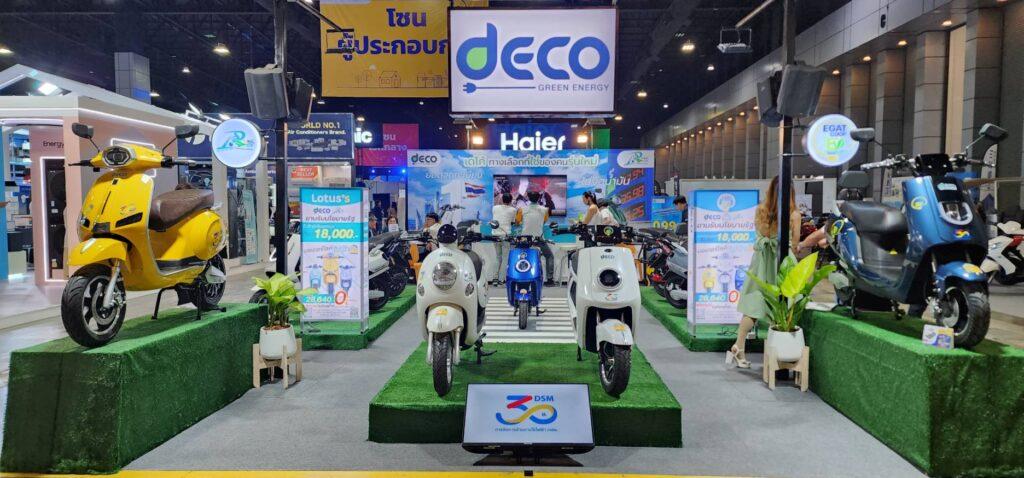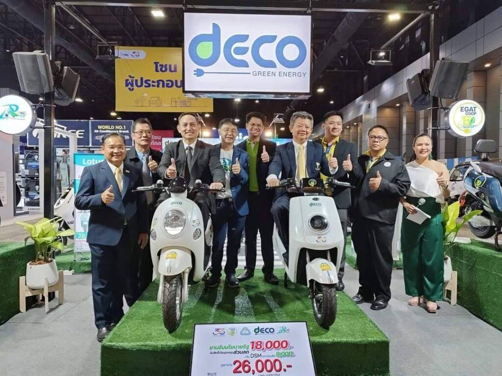 เมื่อวันที่ 20 กันยายน 2566 นายวีรพัฒน์ เกียรติเฟื่องฟู รองปลัดกระทรวงพลังงาน พร้อมด้วยนายประเสริฐ สินสุขประเสริฐ อธิบดีกรมพัฒนาพลังงานทดแทนและอนุรักษ์พลังงาน นายประเสริฐศักดิ์ เชิงชวโน รองผู้ว่าการยุทธศาสตร์ การไฟฟ้าฝ่ายผลิตแห่งประเทศไทย นายกฤชพงศ์ ธรรมมานุกรศรี กรรมการผู้จัดการร้านสหกรณ์ผู้ปฏิบัติงานการไฟฟ้าฝ่ายผลิตแห่งประเทศไทย จำกัด และนายพงษ์ศักดิ์ สุขแสง ผู้จัดการร้านสหกรณ์ผู้ปฏิบัติงานการไฟฟ้าฝ่ายผลิตแห่งประเทศไทย จำกัด สำนักงานใหญ่ ได้เดินเยี่ยมชมบูธจักรยานยนต์ไฟฟ้า DECO ภายในงาน 30 ปี DSM ณ Hall 9 อิมแพ็ค เมืองทองธานี วันที่ 20-24 กันยายน 2566 โดยมีนายอัครชัย รัตนถาวร ผู้จัดการฝ่ายขายและการตลาด บริษัท เดโก้ กรีน เอนเนอร์จี จำกัด ในเครือบริษัท เมคทูวิน โฮลดิ้ง จำกัด (มหาชน) และเกรียงไกร ลาภจตุรพิธ กรรมการผู้จัดการบริษัท พี-ไบค์ ตัวแทนจำหน่ายเดโก้ โครงการพิเศษ ให้การต้อน ซึ่งภายในบูธ DECO ได้ร่วมกับภาครัฐได้รับเงินอุดหนุน 18,000 บาท ให้ประชนชนได้เข้าถึงรถจักรยานยนต์ไฟฟ้าด้วยราคาประหยัดได้รับฉลากเบอร์ 5 แล้วยังได้ร่วมกับสหกรณ์การไฟฟ้าฯ ของ กฟผ. เปิดโครงการจำหน่ายรถจักรยานยนต์ไฟฟ้าในโครงการ EGAT COOP ในราคาพิเศษด้วย
