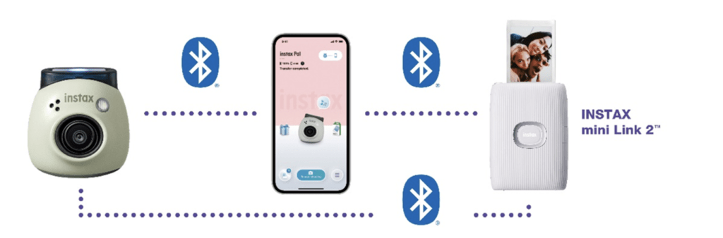 - ปริ้นรูปฟิล์มง่ายๆ โดยตรงด้วยเครื่องปริ้นกลุ่ม INSTAX Link: สามารถปริ้นภาพจากกล้อง INSTAX Pal ทันทีหลังเชื่อมต่อกับเครื่องปริ้นกลุ่ม INSTAX Link รวมไปถึงกล้องอินสแตนท์กลุ่มไฮบริด อาทิ “INSTAX mini Evo” และ “INSTAX mini LiPlay” โดยเลื่อนโหมดที่ด้านล่างของตัวกล้อง INSTAX Pal จาก “F (โหมด FUN)” เป็น “L (โหมด Link)” ตัวกล้องจะเชื่อมต่อบลูทูธโดยตรงกับอุปกรณ์กลุ่ม INSTAX Link ได้โดยไม่ต้องใช้แอป ภาพที่ถ่ายด้วย INSTAX Pal ในโหมดนี้จะถูกปริ้นจากเครื่องปริ้น INSTAX Link โดยอัตโนมัติทันทีเหมือนใช้งานกล้องอินสแตนท์แบบอนาล็อก