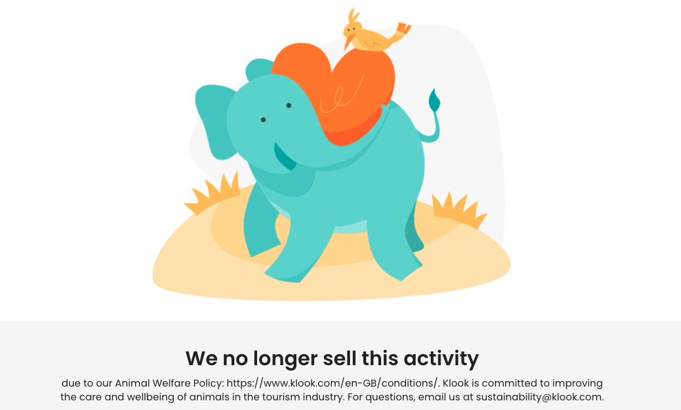 Klook แพลตฟอร์มการท่องเที่ยวระดับโลก ประกาศการตัดสินใจในการยุติการขายบัตรท่องเที่ยวที่เกี่ยวข้องกับการขายโปรแกรมสถานที่ท่องเที่ยวหรือประสบการณ์ที่แสวงประโยชน์จากสัตว์ในประเทศไทย และประเทศอื่น ๆ ทั่วโลก นับเป็นก้าวแรกของการเปลี่ยนแปลงที่สำคัญของ Klook ในการกำหนดนโยบายใหม่ด้านสวัสดิภาพสัตว์ (Animal Welfare) เลิกขายการแสดงโชว์ที่เกี่ยวข้องกับ ช้าง โลมา และเสือ จนกว่าผู้ประกอบการจะเปลี่ยนแปลงรูปแบบการดำเนินงาน นโยบายนี้จะมีกำหนดบังคับใช้ภายในสิ้นเดือนตุลาคม พ.ศ. 2566