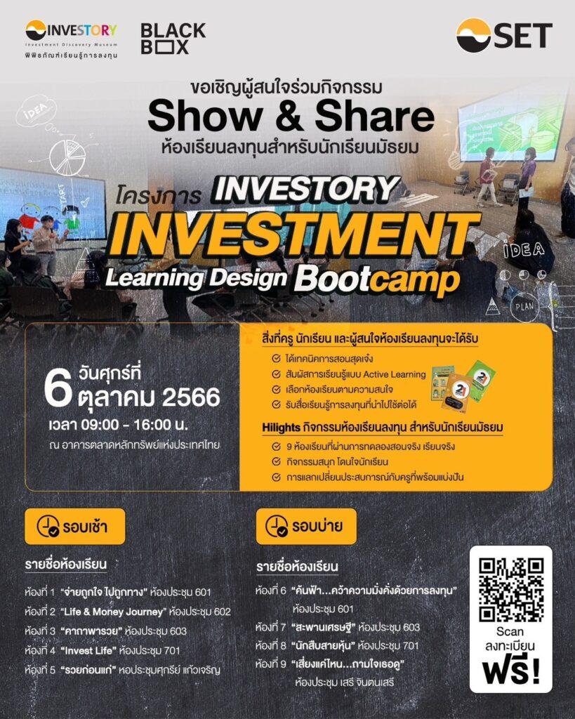 พิพิธภัณฑ์เรียนรู้การลงทุน INVESTORY ตลาดหลักทรัพย์แห่งประเทศไทย ชวนครูอาจารย์ นักเรียน โดยเฉพาะระดับมัธยมศึกษา ตลอดจนผู้สนใจ ร่วมกิจกรรม “Show & Share ห้องเรียนลงทุนสำหรับนักเรียนมัธยม” ในโครงการ INVESTORY Investment Learning Design Bootcamp กับ 9 ห้องเรียนทดลองสอนจริงเรียนจริง เสริมทักษะด้านการเงินและการลงทุน เยาวชนพบกับกิจกรรมสนุกโดนใจ ครูอาจารย์ร่วมแลกเปลี่ยนประสบการณ์ รับเทคนิคการสอน และรับสื่อการเรียนรู้การลงทุนที่นำไปใช้ต่อได้ สัมผัสการเรียนรู้แบบ Active Learning เลือกห้องเรียนตามความสนใจ พบกันวันศุกร์ที่ 6 ต.ค. 2566 เวลา 9:00-16:00 น. ณ ตลาดหลักทรัพย์แห่งประเทศไทย ถ. รัชดาภิเษก ลงทะเบียนร่วมกิจกรรมพร้อมรับสื่อเรียนรู้การลงทุน ฟรี! ที่ https://forms.office.com/r/qT2Sktpp9P ตั้งแต่วันนี้ – 2 ตุลาคม 2566 สอบถามเพิ่มเติมได้ที่ INVESTORY@set.or.th