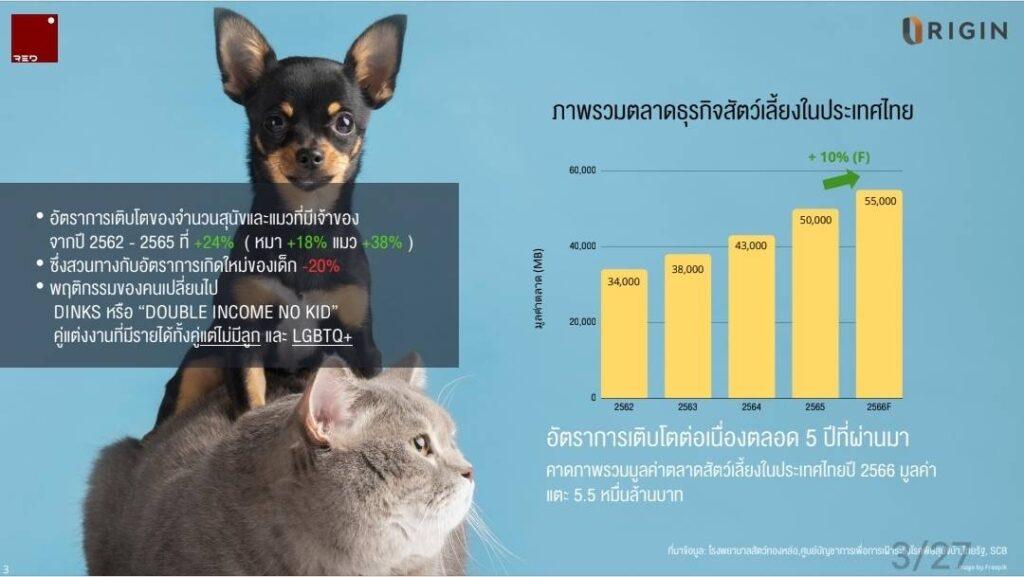 โดยเฉพาะการเลี้ยงสุนัขและแมวของครอบครัวคนรุ่นใหม่เกิดขึ้นทั่วโลก ขณะที่ในประเทศไทยช่วงปี 2562-2565 มีอัตราการเติบโตของจำนวนสุนัข และแมวที่มีเจ้าของอยู่ที่ 24% แบ่งเป็นแมวมีอัตราการเติบโตกว่า 38% และสุนัขเติบโต 18% ทั้งนี้การเติบโตดังกล่าว มาจากพฤติกรรมของคนรึ่นใหม่ที่เปลี่ยนไป โดยมีกลุ่มคนที่เรียกว่า Sinks (Single Income No Kid) หรือคนที่ใช้ชีวิตโสด มีความเหงา ต้องการมีสัตว์เลี้ยงไว้เป็นเพื่อน Dinks (Double Income No Kid) คนที่แต่งงานแล้วมีรายได้ทั้งคู่แต่ไม่มีลูก รวมถึงกลุ่ม LGBTQ+ ซึ่งทั้งหมดเป็นรูปแบบครอบครัวที่มีขนาดเล็กลง และมีสัตว์เลี้ยงไว้เป็นหนึ่งในสมาชิกของครอบครัว ซึ่งส่วนใหญ่เลี้ยงไว้เหมือนเป็นลูก รองลงมาเป็นการเลี้ยงสัตว์เพื่อแสดงสถานะทางสังคม และกลุ่มที่ให้ความช่วยเหลือดูแล
