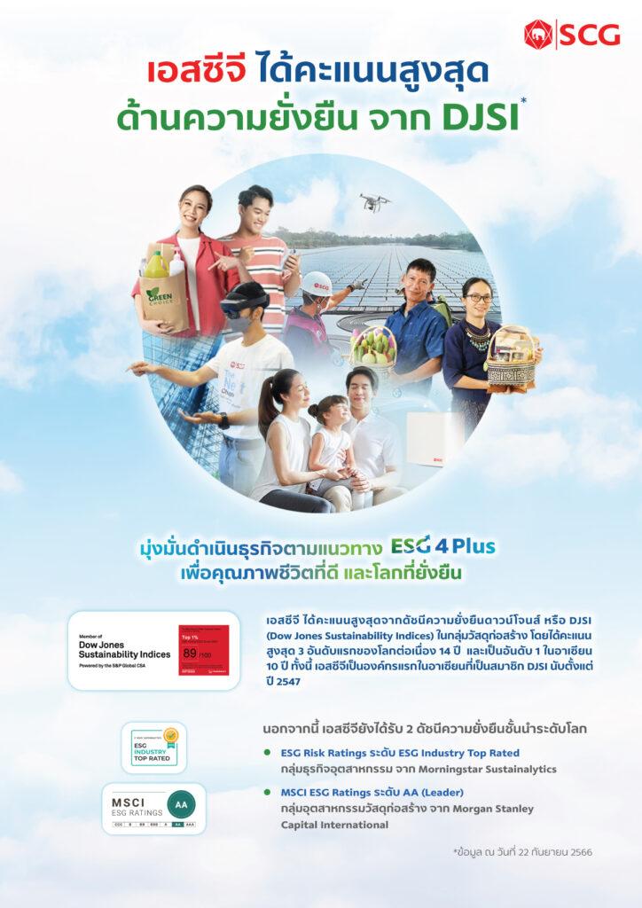 นายรุ่งโรจน์ รังสิโยภาส กรรมการผู้จัดการใหญ่ เอสซีจี กล่าวว่า “เอสซีจีได้รับคะแนนสูงสุดจากดัชนีความยั่งยืนดาวน์โจนส์ หรือ DJSI (Dow Jones Sustainability Indices) ในกลุ่มวัสดุก่อสร้าง ณ วันที่ 22 กันยายน 2566 โดยได้รับคะแนนสูงสุด 3 อันดับแรกของโลกต่อเนื่องเป็นปีที่ 14 และเป็นอันดับ 1 ในอาเซียน 10 ปี ทั้งยังเป็นองค์กรแรกในอาเซียนที่เป็นสมาชิก DJSI ตั้งแต่ปี 2547 ก่อนหน้านี้ เอสซีจีได้รับการประเมินจาก 2 ดัชนีความยั่งยืนชั้นนำระดับโลก ได้แก่ ESG Risk Ratings ระดับ ESG Industry Top Rated กลุ่มธุรกิจอุตสาหกรรมจาก Morningstar Sustainalytics และ MSCI ESG Ratings ระดับ AA กลุ่มอุตสาหกรรมวัสดุก่อสร้างจาก Morgan Stanley Capital International (MSCI) ซึ่งทั้ง 3 ดัชนีความยั่งยืนนี้ นักลงทุนทั่วโลกใช้เป็นข้อมูลประกอบการลงทุนเพื่อสร้างความมั่นใจในผลตอบแทนระยะยาว และสะท้อนถึงธุรกิจที่เติบโตแข็งแกร่ง ควบคู่กับการพัฒนาสังคม สิ่งแวดล้อมที่ยั่งยืน”