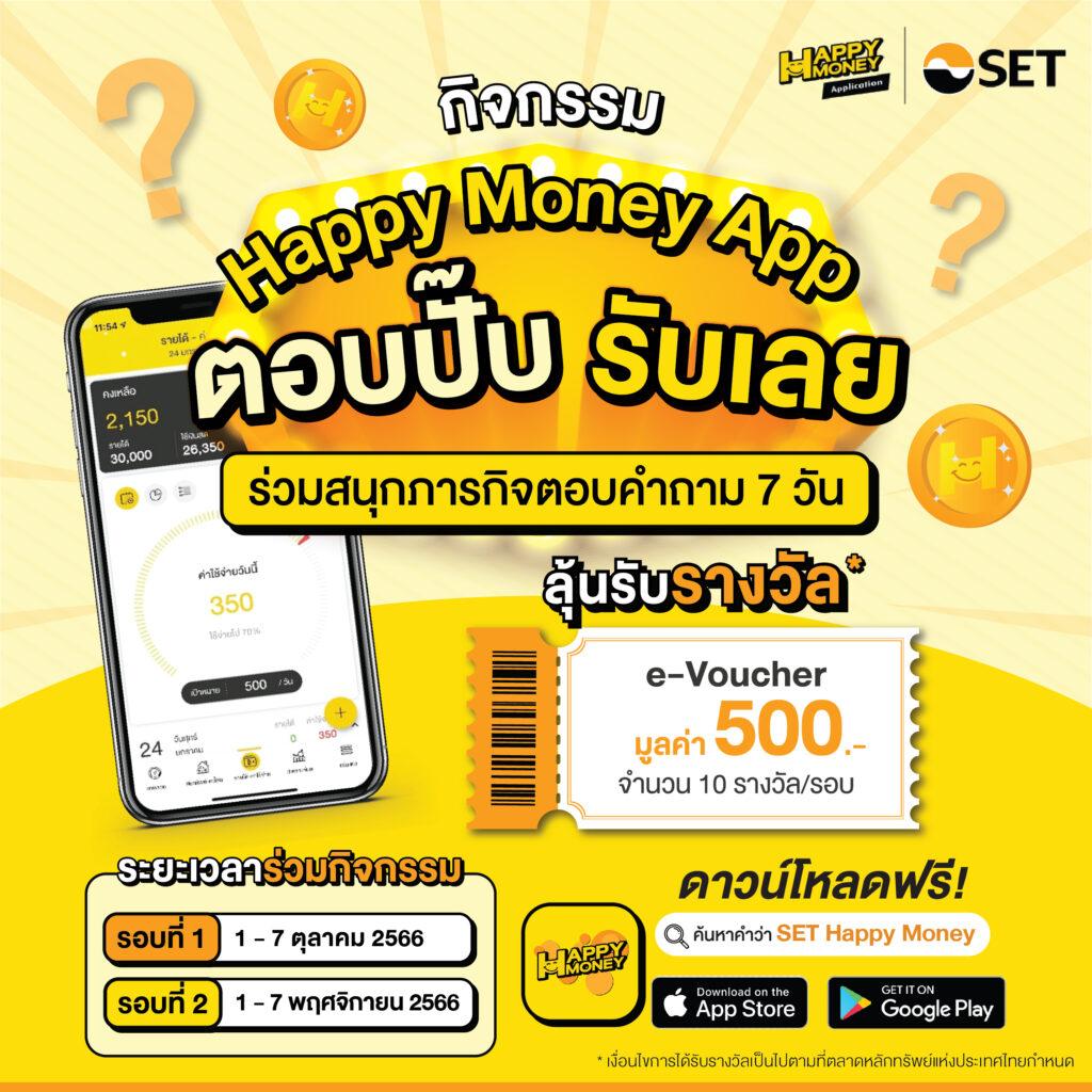 ตลาดหลักทรัพย์แห่งประเทศไทย ชวนผู้สนใจร่วมกิจกรรม “Happy Money App ตอบปั๊ป รับเลย” เตรียมตัวให้พร้อม สิทธิพิเศษสำหรับผู้ที่ Login ด้วย SET Member เท่านั้น ร่วมสนุกตอบคำถามเกี่ยวกับการบริหารจัดการเงิน ต่อเนื่อง 7 วัน โดยแบ่งเป็น 2 รอบ รอบที่ 1: วันที่ 1-7 ตุลาคม 2566 รอบที่ 2: วันที่ 1-7 พฤศจิกายน 2566 ผู้ที่มีคะแนนสูงสุด 10 อันดับแรกในแต่ละรอบ ลุ้นรับรางวัล e-Voucher มูลค่า 500 บาท Happy Money App ดาวน์โหลดฟรีได้ทั้ง IOS และ Android ค้นหาคำว่า SET HAPPY MONEY ตอบทุกวัน ยิ่งมีโอกาสมาก! ดูรายละเอียดและกติกาเพิ่มเติมที่ https://shorturl.at/bwB12