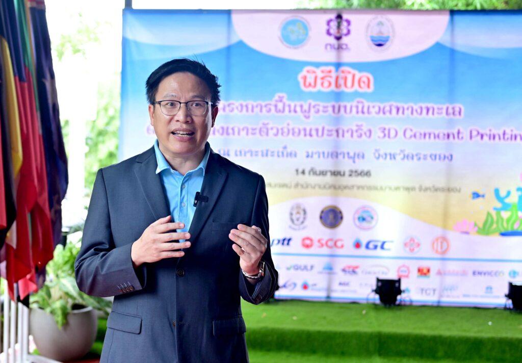 นายสุขธวัช พัทธวรากร ผู้อำนวยการทรัพยากรธรรมชาติและพันธกิจสังคม บริษัท ปูนซิเมนต์ไทย จำกัด (มหาชน) กล่าวว่า สำหรับการเปิดตัวโครงการฟื้นฟูปะการังด้วยฐานลงเกาะตัวอ่อนปะการัง 3D Concrete Printing บริเวณเกาะสะเก็ด ตำบลมาบตาพุด อำเภอเมือง จังหวัดระยอง โดยทาง กนอ. และมูลนิธิเพื่อการอนุรักษ์-ฟื้นฟูปะการังและชายหาด (มอป.) ในครั้งนี้ ทาง เอสซีจี รู้สึกยินดีเป็นอย่างยิ่งที่ได้มีส่วนร่วมในการสนับสนุนในโครงการดังกล่าว ซึ่งนวัตกรรมบ้านปะการังนี้ เหมาะเป็นแหล่งเพาะพันธุ์ปะการังและสัตว์น้ำ ผลิตจากปูนซีเมนต์รักษ์โลกที่เป็นมิตรต่อสิ่งมีชีวิตใต้ทะเล ที่ช่วยในการฟื้นฟูทรัพยากรท้องทะเลไทยได้อย่างยั่งยืน และจากความร่วมมือในครั้งนี้ เอสซีจี มุ่งหวังเป็นส่วนหนึ่งในการสร้างความมีส่วนร่วมจากพันธมิตรทางธุรกิจ เครือข่ายภาครัฐ ภาคประชาชน ภาควิชาการและสังคม ในการร่วมสนับสนุนอนุรักษ์เป็นพลังขับเคลื่อนให้เกิดความร่วมมือกันในอนาคตและสามารถขยายผล อย่างเป็นรูปธรรมได้จริง อันจะก่อให้เกิดความยั่งยืนในการพัฒนาและการดูแลรักษาทรัพยากรธรรมชาติถึงคนรุ่นต่อๆ ไป