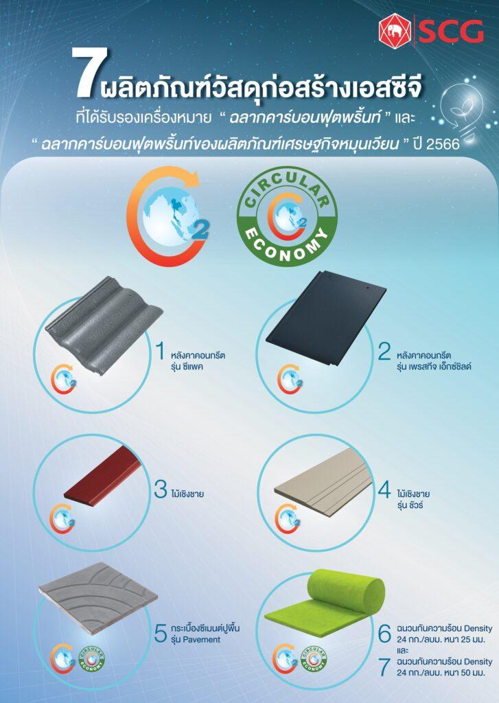 ในปี 2566 เอสซีจีได้ขึ้นทะเบียนรับฉลากคาร์บอนฟุตพริ้นท์ เพิ่มเติม 7 ผลิตภัณฑ์ ได้แก่ กลุ่มกระเบื้องหลังคา ประกอบด้วยกระเบื้องหลังคาคอนกรีต เอสซีจี รุ่น ซีแพค และ กระเบื้องหลังคาคอนกรีต เอสซีจี รุ่นเพรสทีจ เอ็กซ์ชิลด์, กลุ่มไม้สังเคราะห์ ประกอบด้วยไม้เชิงชาย เอสซีจี และ ไม้เชิงชาย เอสซีจี Fascia Sure, กลุ่มฉนวนกันความร้อน ประกอบด้วยฉนวนกันความร้อน เอสซีจี Density 24 กก./ลบม. หนา 25 มม. และ ฉนวนกันความร้อน เอสซีจี Density 24 กก./ลบม. หนา 50 มม. และ กลุ่มกระเบื้องปูพื้น ประกอบด้วยกระเบื้องซีเมนต์ปูพื้น เอสซีจี รุ่น Pavement โดยผลิตภัณฑ์ฉนวนกันความร้อน และกระเบื้องซีเมนต์ปูพื้น ได้รับฉลากคาร์บอนฟุตพริ้นท์ของผลิตภัณฑ์เศรษฐกิจหมุนเวียนร่วมด้วย ซึ่งส่งผลให้ภาพรวมในปัจจุบันผลิตภัณฑ์วัสดุก่อสร้างเอสซีจี ได้รับการรับรองฉลากคาร์บอนฟุตพริ้นท์รวมทั้งหมดมากกว่า 100 รายการ โดยมีการประเมินคาร์บอนฟุตพริ้นท์ตามมาตรฐานสากลตลอดห่วงโซ่อุปทาน ตั้งแต่การคัดเลือกวัตถุดิบ กระบวนการผลิต การขนส่ง การบริโภค ตลอดจนการกำจัดซากทิ้งของผลิตภัณฑ์ มุ่งเน้นการลดการปล่อยก๊าซคาร์บอนไดออกไซด์ให้เหลือน้อยที่สุด