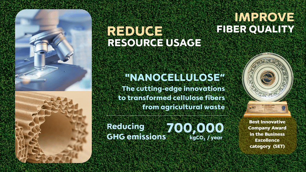 นอกจากนี้ SCGP ได้ศึกษาและพัฒนานวัตกรรม “เส้นใยนาโนเซลลูโลส” จากวัตถุดิบเหลือใช้ทางการเกษตร เพื่อน้ำไปใช้เป็นวัตถุดิบในกระบวนการผลิตกระดาษบรรจุภัณฑ์ ซึ่งได้มีการจดสิทธิบัตรเป็นที่เรียบร้อยแล้วทั้งในประเทศและต่างประเทศ