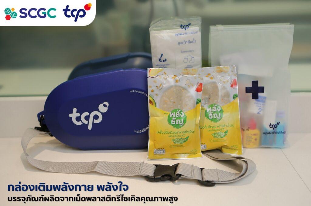 นอกจากนี้ SCGC ยังได้ร่วมกับกลุ่มธุรกิจ TCP พัฒนา “กล่องเติมพลังกาย พลังใจ” เพื่อเตรียมความพร้อมในการช่วยเหลือผู้ได้รับผลกระทบจากภัยพิบัติที่อาจเกิดขึ้นจากการเปลี่ยนแปลงสภาพภูมิอากาศ  โดยกล่องผลิตจากเม็ดพลาสติกรีไซเคิลคุณภาพสูง (High Quality Post-Consumer Recycled Resin: PCR) มีคุณสมบัติกันน้ำ รองรับการกระแทก น้ำหนักเบา สามารถพกพาได้สะดวก และภายในกล่องบรรจุนวัตกรรมด้านอาหารจากกลุ่มธุรกิจ TCP ที่มีโปรตีนและเส้นใยอาหารสูงผลิตจากวัตถุดิบธรรมชาติ เพื่อให้ผู้ประสบภัยสามารถเข้าถึงความช่วยเหลือได้อย่างทันท่วงที