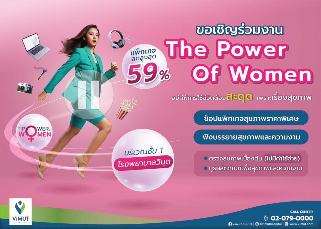 สำหรับแคมเปญ “The Power of Women” ถือเป็นส่วนหนึ่งในแผนการดำเนินงานของโรงพยาบาลวิมุตในการสนับสนุนให้หญิงไทยทุกคนมีสุขภาพร่างกายแข็งแรง ด้วยการให้ผู้หญิงทุกช่วงวัยสามารถดูแลสุขภาพได้อย่างคุ้มค่าและสะดวกสบายผ่านการนำเสนอแพ็กเกจซึ่งล้วนดำเนินการโดยแพทย์ผู้ชำนาญการในสาขาต่าง ๆ พร้อมด้วยการใช้นวัตกรรมทางการแพทย์ที่ได้มาตรฐาน ให้ทุกการรักษามีความแม่นยำและเปี่ยมประสิทธิภาพ ช่วยลดอัตราการเกิดโรคและการเสียชีวิตของผู้หญิง ซึ่ง รพ. วิมุต เชื่อมั่นว่าแคมเปญนี้จะสามารถตอบโจทย์ความจำเป็นด้านสุขภาพของผู้หญิงในแต่ละช่วงวัยได้เป็นอย่างดี