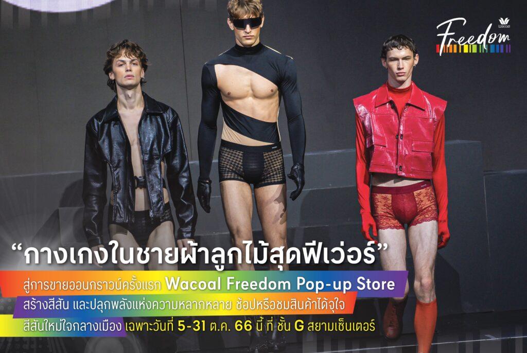 Wacoal x Siam Center เปิดจุดเช็คอินใหม่อิสระแห่งความสร้างสรรค์ใจกลางสยามเซ็นเตอร์ โดยวาโก้ได้เนรมิต Wacoal Freedom Pop-up Store คอนเซ็ปต์ อิสระ…ที่ไม่มีนิยาม เพิ่มดีกรีสีสันแห่งสายรุ้งภายใน Pop-up Store เพื่อต้อนรับทุกคนทุกเพศทุกวัยให้มาเช็คอินและเชื่อมต่อความหลากหลาย สะท้อนความเป็นตัวตนแบบไร้ขีดจำกัด พร้อมเปิดขายออนกราวน์ครั้งแรกกับ ‘กางเกงในชายผ้าลูกไม้’ สุดฟีเว่อร์ หลังเปิดตัวในงานสหกรุ๊ปแฟร์ฯ รุ่น LIMITED UNDERWEAR ซึ่งมีทั้งแบบบ็อกเซอร์และบิกินี่ รวมทั้งรุ่นพิเศษ Lace Boxer กางเกงบ็อกเซอร์ผ้าลูกไม้สีแดงและดำ รวมถึงสินค้าอีกหลากหลายตอบทุกความต้องการของกลุ่ม LGBTQ อาทิ เสื้อกล้ามกระชับอกช่วยพรางอก สมาร์ท มั่นใจ หรือต้องการจะเสกหุ่นให้ดูสาว เอวคอด สะโพกผาย ด้วยยกทรงช่วยดันทรง, แผ่นกระชับใต้อก, กางเกงในกระชับเป้า และกางเกงเสริมสะโพก เป็นต้น