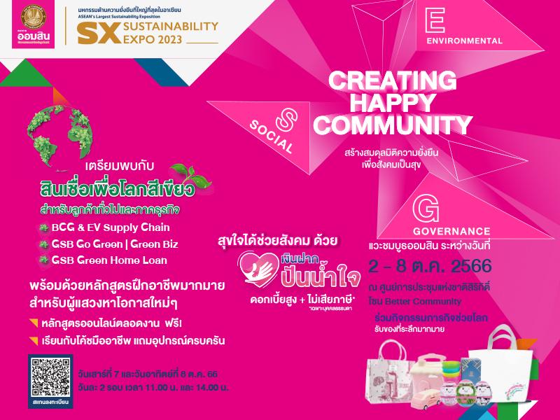 สำหรับธนาคารออมสินได้เข้าร่วมงานด้วยในโซน Better Community ภายใต้แนวคิด “Creating Happy Community : สร้างสมดุลมิติความยั่งยืน เพื่อสังคมเป็นสุข” โดยนำเสนอผลงานความสำเร็จของธนาคารเพื่อสังคมที่สามารถสร้างผลลัพธ์เชิงบวกได้อย่างเป็นรูปธรรม ผ่านโครงการพัฒนาสังคมและชุมชนมากมาย รวมถึงบอกเล่าความสำเร็จของการบูรณาการมิติทางสังคมเข้าในกระบวนการปฏิบัติงานด้วยกลไก Social Mission Integration เพื่อให้เกิดความยั่งยืนในการสร้างประโยชน์ต่อสังคม ทั้งนี้ การเข้าร่วมเป็นผู้สนับสนุนหลักและร่วมออกบูธในงาน SX2023 ครั้งนี้ นับเป็นการแสดงจุดยืนชัดเจนของการเป็นภาคการเงินที่สนับสนุนการเปลี่ยนผ่านสู่สังคมคาร์บอนต่ำ โดยผู้เข้าชมงานจะได้พบกับผลิตภัณฑ์การเงินสีเขียว สำหรับผู้ที่สนใจสินเชื่อเงื่อนไขพิเศษเพื่อลูกค้ารายย่อย ผู้ประกอบการ SMEs และธุรกิจ ไม่ว่าจะเป็นสินเชื่อ EV Supply Chain สินเชื่อ BCG, GSB Go Green, GSB Green Biz, GSB Green Home Loan รวมถึงเงินฝากปันน้ำใจเงื่อนไขพิเศษสำหรับผู้ฝากเงินที่เลือกบริจาคช่วยเหลือมูลนิธิที่เข้าร่วมโครงการ