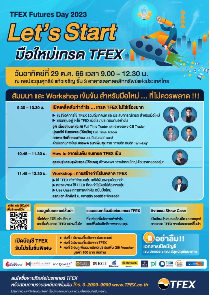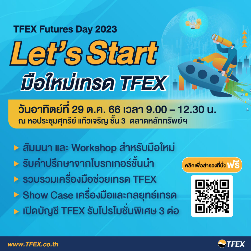 บมจ. ตลาดสัญญาซื้อขายล่วงหน้า (ประเทศไทย) ชวนร่วมงาน “TFEX Futures Day 2023: Let’s Start มือใหม่เทรด TFEX” ชวนมือใหม่เรียนรู้ TFEX หาทางรอดให้พอร์ตช่วงตลาดขาลง อัดแน่นด้วยสัมมนา Workshop และกิจกรรมเข้มข้น เริ่มด้วยหัวข้อ “เปิดเคล็ดลับทำกำไร…เทรด TFEX ไม่ใช่เรื่องยาก” ร่วมแชร์ประสบการณ์และเทคนิคการเทรด TFEX สำหรับมือใหม่ โดย จุติ เนื่องจำนงค์ หรือ อ. ติ เจ้าของเพจ CB Trader ปุณยวีร์ จันทรขจร หรือโค้ชเป๊ก Full Time Trader และทศพล ศักดิ์ถาวรดำรง บล. Innovest X หัวข้อ “How to จากเริ่มต้น จนเทรด TFEX เป็น” แบ่งปันเทคนิคการเทรดให้มือใหม่ โดย สุรเชษฐ์ เศรษฐพัชรกุล หรือโค้ชเคน เจ้าของเพจ “อ่านใจรายใหญ่ ด้วยราคา&วอลลุ่ม” และ “WORKSHOP: การสร้างกำไรในตลาด TFEX” ใช้ TFEX ทำกำไรแบบหุ้นด้วยเงินลงทุนที่น้อยกว่า ตลาดขาลงใช้ TFEX ล็อกกำไรโดยไม่ต้องขายหุ้น และสรุป Use Case การเทรดค่าเงินฉบับมือใหม่ โดย จรณเวท ศักดิ์ศรี บ. คลาสสิก ออสสิริส ฟิวเจอร์ พร้อมกิจกรรม Showcase นำเสนอเครื่องมือและกลยุทธ์การเทรด และโปรโมชันเปิดบัญชีภายในงาน สำหรับผู้ที่ยังไม่มีบัญชี TFEX พบกันอาทิตย์ที่ 29 ต.ค. 66 เวลา 9.00-12.30 น. ชั้น 3 ตลาดหลักทรัพย์ฯ ลงทะเบียนฟรี www.TFEX.co.th สอบถามโทร 0 2009 9999