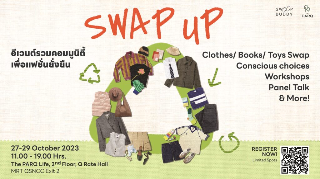 มาร่วมกันเป็นส่วนหนึ่งของการเปลี่ยนแปลงโลกใบนี้แบบยั่งยืน ได้ที่งาน “SWAP UP” The PARQ Life, ชั้น 2, Q Rate Hall (MRT ศูนย์การประชุมแห่งชาติสิริกิติ์ ทางออก 2) วันที่ 27 – 29 ตุลาคมนี้