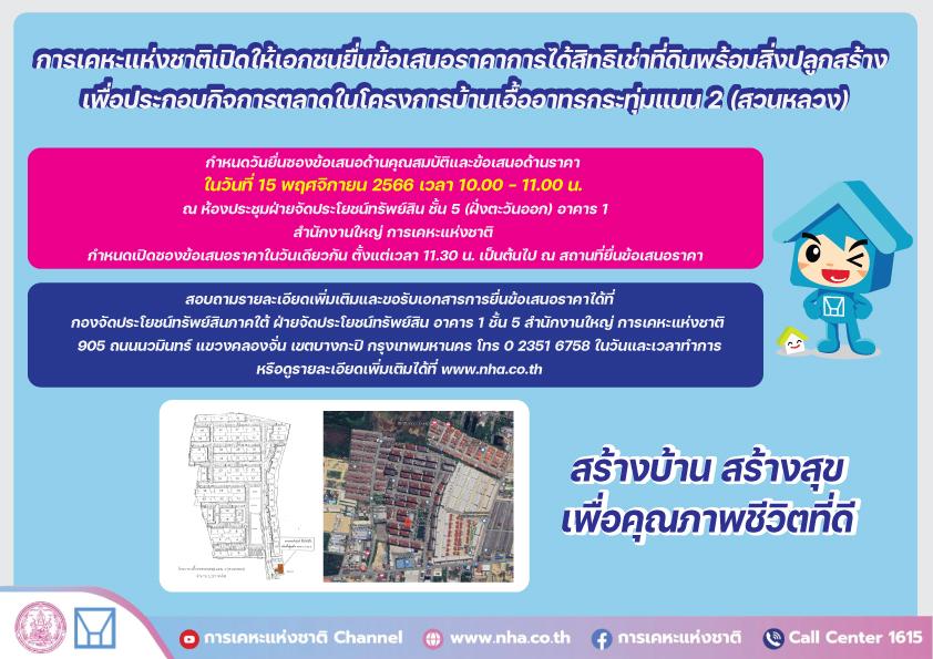 นางสิริกร พัชรกุลวรรณ ผู้ช่วยผู้ว่าการการเคหะแห่งชาติ กล่าวว่า การเคหะแห่งชาติมีความประสงค์ให้เอกชนยื่นข้อเสนอราคาการได้สิทธิเช่าที่ดินพร้อมสิ่งปลูกสร้างเพื่อประกอบกิจการตลาดภายในโครงการบ้านเอื้ออาทรกระทุ่มแบน 2 (สวนหลวง) เพื่อให้เกิดความโปร่งใสในการดำเนินงานทุกขั้นตอนตามหลักธรรมาภิบาล จึงเปิดโอกาส