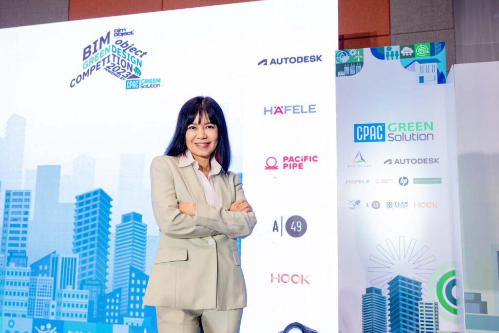 นางสาวกัลยา วรุณโณ Green Solution and New Business Marketing Director – Marketing and Branding, Cement and Green Solution Business ในธุรกิจซีเมนต์และผลิตภัณฑ์ก่อสร้าง เอสซีจี ในฐานะผู้สนับสนุนหลักโครงการประกวดฯ กล่าวว่า ขอแสดงความยินดีกับน้องๆ ทุกคนที่ได้รับรางวัลในวันนี้ ทาง CPAC Green Solution เอง รู้สึกภูมิใจเป็นอย่างมากที่ได้สนับสนุนการประกวดโครงการ BIMobject Green Design Competition 2023 ในครั้งนี้ ซึ่งจากที่ได้เห็นผลงานการออกแบบ และการทำงานของเหล่านิสิต-นักศึกษา แต่ละทีมที่ส่งผลงานเข้ามาประกวดในปีนี้ เชื่อมั่นได้ว่าอนาคตวงการก่อสร้างของเมืองไทยจะมุ่งสู่ Net Zero ได้อย่างแน่นอน สำหรับการประกวดนี้ CPAC Green Solution ได้เป็นผู้สนับสนุนเป็นปีที่ 2 แล้วเพื่อเป็นการผลักดันให้เกิดองค์ความรู้ และให้เกิดการนำกระบวนการ BIM และเทคโนโลยีดิจิทัลมาใช้ร่วมกับการเลือกใช้วัสดุก่อสร้างที่เป็นมิตรกับสิ่งเเวดล้อม ซึ่งถือเป็นส่วนผลักดันในการขับเคลื่อนแนวทาง ESG และเป็นการปลูกฝังให้เหล่านิสิต-นักศึกษา หรือคนรุ่นใหม่ได้ใส่ใจในสินค้าและบริการที่เป็นมิตรต่อสิ่งแวดล้อม อีกทั้งยังได้มอบประสบการณ์และความรู้ ทั้งในด้านการใช้ทรัพยากรหมุนเวียน เปลี่ยน Waste หรือความสูญเสียให้เป็น Value หรือการสร้างผลประโยชน์คืนกลับสู่สังคม เพื่อยกระดับมาตรฐานการก่อสร้างของประเทศให้เติบโตอย่างยั่งยืน”