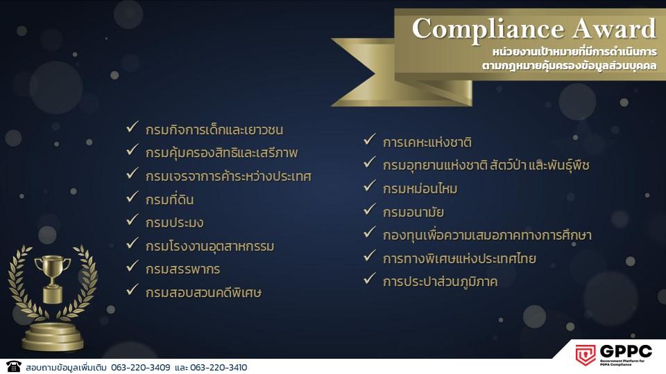 อย่างไรก็ตาม ในปีงบประมาณ 2566 สคส. และ สดช. ได้ส่งเสริมให้หน่วยงานภาครัฐขับเคลื่อนการดำเนินงานตามพระราชบัญญัติคุ้มครองข้อมูลส่วนบุคคลผ่านเทคโนโลยีดิจิทัล โดยประเมินภายใต้เงื่อนไขและวิธีการประเมินที่สำนักงานประกาศและกำหนดไว้ระหว่างเดือนกุมภาพันธ์ – กันยายน 2566 ซึ่งมี 43 หน่วยงานนำร่องที่ได้รับรางวัล Compliance Award หน่วยงานเป้าหมายที่มีการดำเนินการตามกฎหมายคุ้มครองข้อมูลส่วนบุคคล (PDPA) เช่น การเคหะแห่งชาติ กรมกิจการเด็กและเยาวชน กรมสรรพากร กรมสอบสวนคดีพิเศษ การไฟฟ้าฝ่ายผลิตแห่งประเทศไทย การทางพิเศษแห่งประเทศไทย ธนาคารออมสิน บริษัท ปตท. จำกัด (มหาชน) การประปาส่วนภูมิภาค