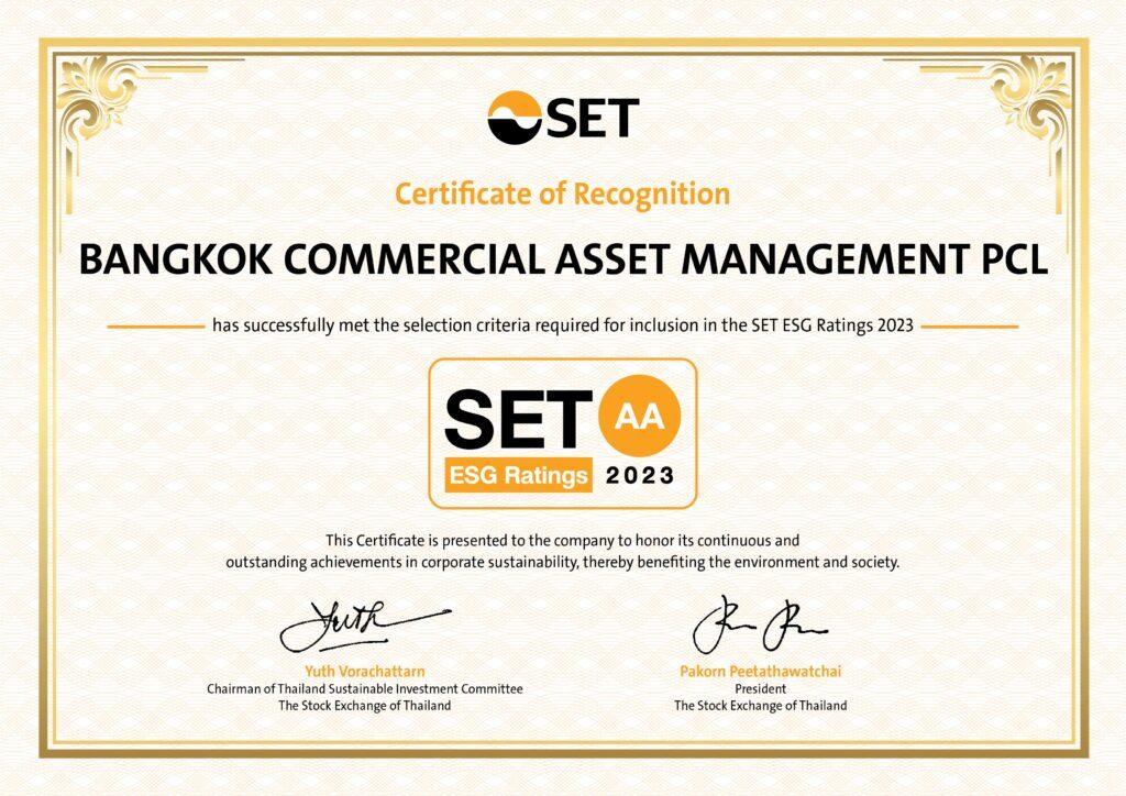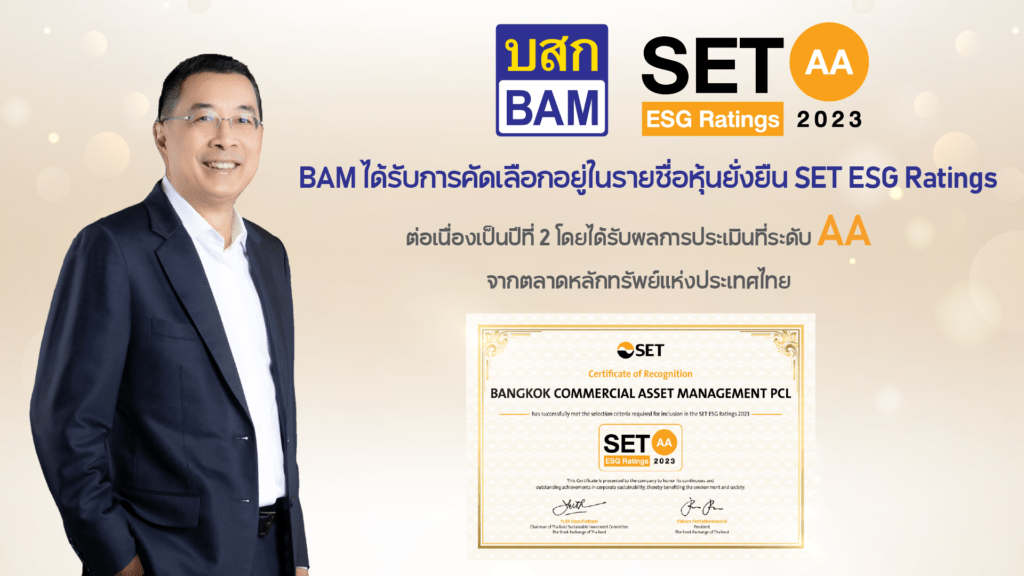 บริษัทบริหารสินทรัพย์ กรุงเทพพานิชย์ จำกัด (มหาชน) หรือ BAMได้รับการประเมินหุ้นยั่งยืน “SET ESG Rating” ในระดับ AA ประจำปี 2566 จากตลาดหลักทรัพย์แห่งประเทศไทย โดยเป็น 1 ใน 193 บริษัทจดทะเบียนที่ได้รับการประกาศผลประเมินหุ้นยั่งยืน SET ESG Ratings สะท้อนให้เห็นว่า BAM ให้ความสำคัญต่อการดำเนินธุรกิจอย่างยั่งยืน โดยยกระดับการดำเนินงานและการจัดทำรายงานความยั่งยืนภายใต้กรอบ ESG (Environmental, Social and Governance) ในมิติเศรษฐกิจ มิติธรรมาภิบาล มิติสิ่งแวดล้อม มิติผู้คนและสิทธิมนุษยชน เป็นบริษัทที่มีการนำแนวคิดด้านความยั่งยืนเข้าเป็นส่วนหนึ่งในกระบวนการดำเนินธุรกิจ อีกทั้งพร้อมรับมือกับปัจจัยการเปลี่ยนแปลงด้านสังคมและสิ่งแวดล้อมและให้ความสำคัญกับผู้มีส่วนได้เสียทุกภาคส่วนได้อย่างสมดุล