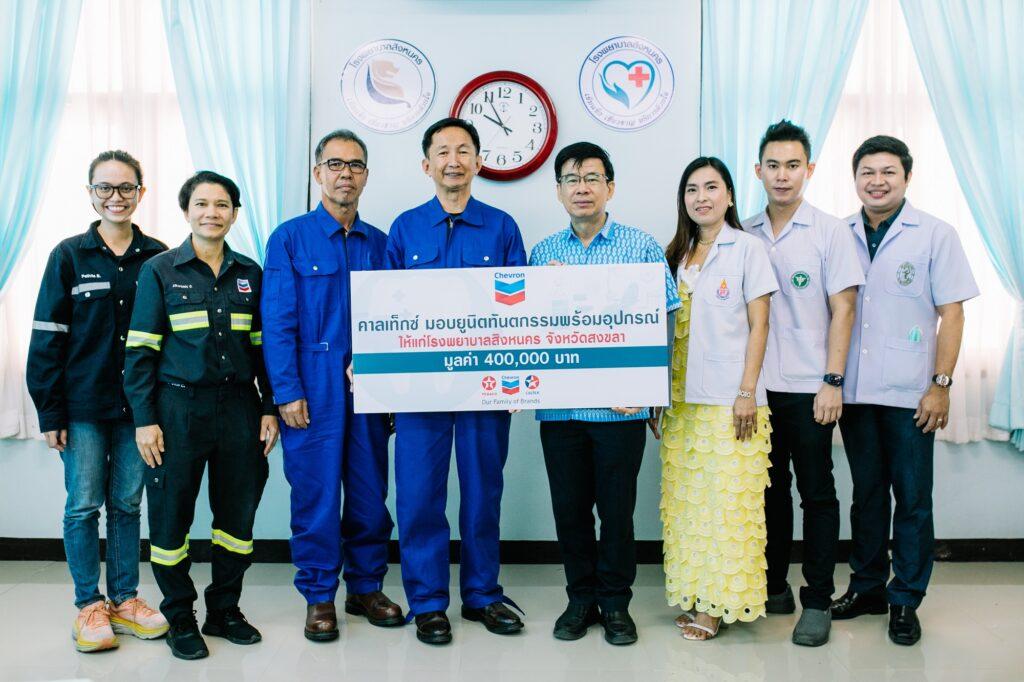 เมื่อเร็ว ๆ นี้ บริษัท เชฟรอน (ไทย) จำกัด ผู้จัดจำหน่ายผลิตภัณฑ์คาลเท็กซ์ นำโดย นายณรงค์ เอี่ยมพงษ์ไพฑูรย์ ผู้จัดการคลังน้ำมันร่วมสงขลา (ที่ 4 จากซ้าย) ร่วมสนับสนุนยูนิตทันตกรรม พร้อมเครื่องมือทางการแพทย์ภายใต้โครงการ “ยูนิตทันตกรรมเพื่อชาวสิงหนคร” มูลค่า 400,000 บาท ให้แก่โรงพยาบาลสิงหนคร จังหวัดสงขลา เพื่อรองรับการเข้าถึงบริการทางทันตกรรมของประชาชนในพื้นที่และพื้นที่ใกล้เคียงให้ได้มากขึ้น โดยมี นายแพทย์นครินทร์ ฉินตระกูลประดับ รักษาการในตำแหน่ง ผู้อำนวยการโรงพยาบาลสิงหนคร (ที่ 4 จากขวา) พร้อมด้วยคณะผู้บริหาร แพทย์ เป็นตัวแทนรับมอบ ณ โรงพยาบาลสิงหนคร อำเภอสิงหนคร จังหวัดสงขลา