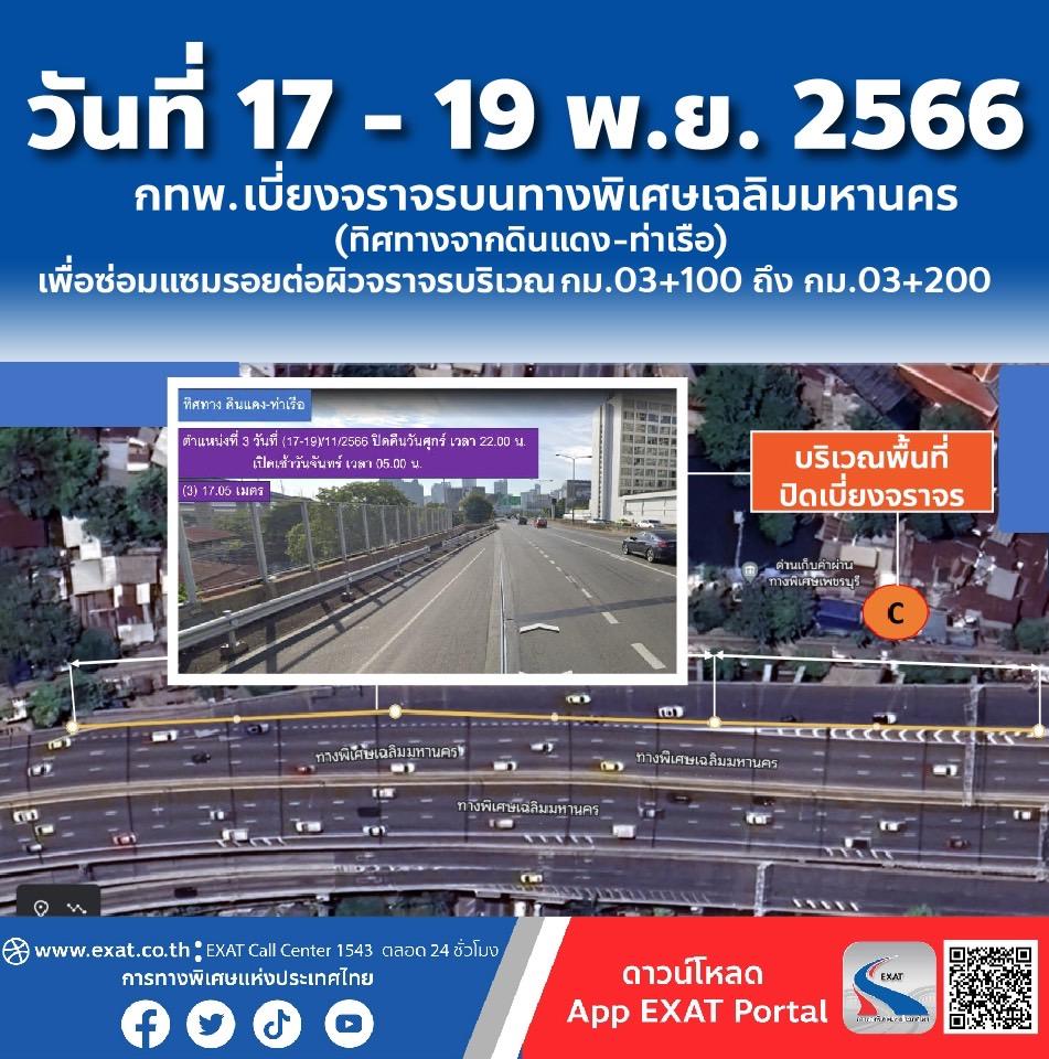 ​ การทางพิเศษแห่งประเทศไทย (กทพ.) กระทรวงคมนาคม ได้ว่าจ้างบริษัทกิจการร่วมค้า DW เพื่อดำเนินการซ่อมแซมรอยต่อผิวจราจรบนทางพิเศษเฉลิมมหานคร (ทิศทางมุ่งหน้าจากดินแดง – ท่าเรือ) บริเวณช่วง กม.03+100 ถึง กม.03+200 ช่องทางซ้ายทางรวมมาจากถนนพระราม 9 และดินแดง จึงมีความจำเป็นจะต้องปิดและเบี่ยงจราจรตั้งแต่วันที่ 17 – 19 พฤศจิกายน 2566 ตลอด 24 ชั่วโมง