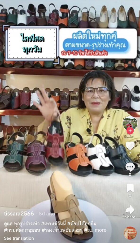 คุณทัศเล่าถึงที่มาที่ไปของการได้เข้ามาร่วมเป็นหนึ่งในผู้ขายสินค้า OTOP ผ่านทาง TikTok Shop ว่า “มีโอกาสได้เข้าร่วมการอบรมของกรมการพัฒนาชุมชนที่มาคัดเลือกผู้ประกอบการในจังหวัดนนทบุรี โดยมีเจ้าหน้าที่จาก TikTok Shop มาเป็นวิทยากรเองเลย ส่วนตัวคือไลฟ์ไม่เป็น และที่ไปเข้าร่วมการอบรมก็เพราะอยากไลฟ์ให้ได้ ก็โฟกัสที่เรื่องนี้เป็นหลักเลยค่ะ พอเริ่มเข้าใจวิธีการก็เอากลับมาใช้ไลฟ์ทุกวันเพื่อขายรองเท้าหนังวัวแท้ซึ่งเป็นสินค้าของเรา รองเท้าของเรามีจุดเด่นที่การเย็บขอบรอบพื้น ซึ่งจะทนทานกว่าการใช้กาว และที่สำคัญคือเราใส่ใจทุกรายละเอียด ผลิตใหม่ทุกคู่ตามรูปร่างเท้าของลูกค้าเพื่อให้ตรงกับสรีระของผู้สวมใส่ เป็นจุดเด่นที่เราตั้งใจคิดมาเพื่อให้การขายออนไลน์ของเราแตกต่างไปจากร้านค้าทั่วไปโดยเรานำเสนอเป็นเหมือนคอนเทนต์ให้ลูกค้าเลือกสั่งรองเท้าที่สามารถปรับตามขนาดรูปเท้าได้ถึง 7 แบบ ซึ่งก็ทำให้เรามียอดขายเข้ามาอย่างต่อเนื่องทุกวัน แต่ก็คิดว่าเรายังต้องเรียนรู้ต่อไปค่ะ ทั้งเรื่องเทคนิคการให้ส่วนลดโปรโมชันระหว่างหน้าไลฟ์กับการขายปกติเพื่อที่จะต่อยอดให้ตัวเอง ซึ่งในเรื่องนี้ทาง TikTok Shop ก็ให้ความช่วยเหลือกับเราอย่างเต็มที่”