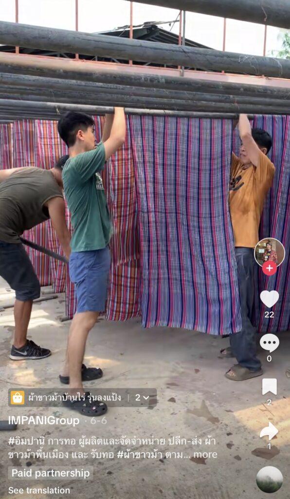 คุณเอกจากแบรนด์อิมปานิ (IMPANI PAKAOMA) ซึ่งนำผ้าขาวม้ามาแปรรูปเป็นเสื้อผ้าและของใช้หลากหลายเล่าว่า เมื่อเขาได้พบกับช่องทางออนไลน์อย่าง TikTok Shop ก็นำไปสู่ความสำเร็จที่คาดไม่ถึง “ที่บ้านเราทำโรงงานทอผ้ามาตั้งแต่ปี 2516 ผมเป็นรุ่นที่ 3 ที่เข้ามาต่อยอดก็เริ่มมองเห็นว่าผ้าขาวม้าเริ่มไม่เป็นที่นิยม เราก็เลยมองในมุมของคนรุ่นใหม่ว่าผ้าขาวม้าน่าจะไปต่อได้ด้วยการปรับสี และลายผ้าใหม่ให้ดูมีความน่าใช้งานมากขึ้น สวยขึ้น ประกอบกับเรื่องคุณสมบัติของผ้าขาวม้าบ้านไร่ซึ่งเป็นผ้าที่แห้งไว ไม่เกิดเชื้อรา และกลิ่นอับ ตากในที่ร่มก็แห้งไว ยิ่งซักยิ่งนิ่มเพราะผลิตจากด้ายฝ้ายเป็นหลัก ทั้งหมดนี้เป็นจุดเด่นของสินค้าที่เรามี พอได้มาเข้าร่วมโครงการกับทาง TikTok Shop และกรมการพัฒนาชุมชน เราได้เรียนรู้เรื่องการถ่ายวิดีโอ แม้ว่าจะเก้ๆ กังๆ ในตอนแรก เพราะค่อนข้างไม่คุ้นชิน เลยทำคลิปแบบเน้นภาพ และตัดต่อนิดหน่อยแต่ผลตอบรับก็ค่อนข้างดี ทำให้คนเห็นสินค้าของเรามากขึ้นมาก และทำยอดขายทางออนไลน์ได้มากที่สุด เมื่อเทียบกับแพลตฟอร์มอื่นซึ่งสำหรับเราถือว่าเหนือความคาดหมาย ทั้งหมดนี้อาจจะเพราะเราเลือกทำคอนเทนต์เกี่ยวกับกระบวนการผลิตซึ่งช่วยสร้างความน่าเชื่อถือให้กับเรา เพราะทุกคนที่ดู TikTok จะเห็นว่าเรามีโรงงานจริง การันตีคุณภาพได้ ก็ต้องขอบคุณ TikTok Shop ที่เป็นอีกหนึ่งช่องทางให้กับเรา และยังสนับสนุนเราเต็มที่ในทุกๆ ด้านครับ”