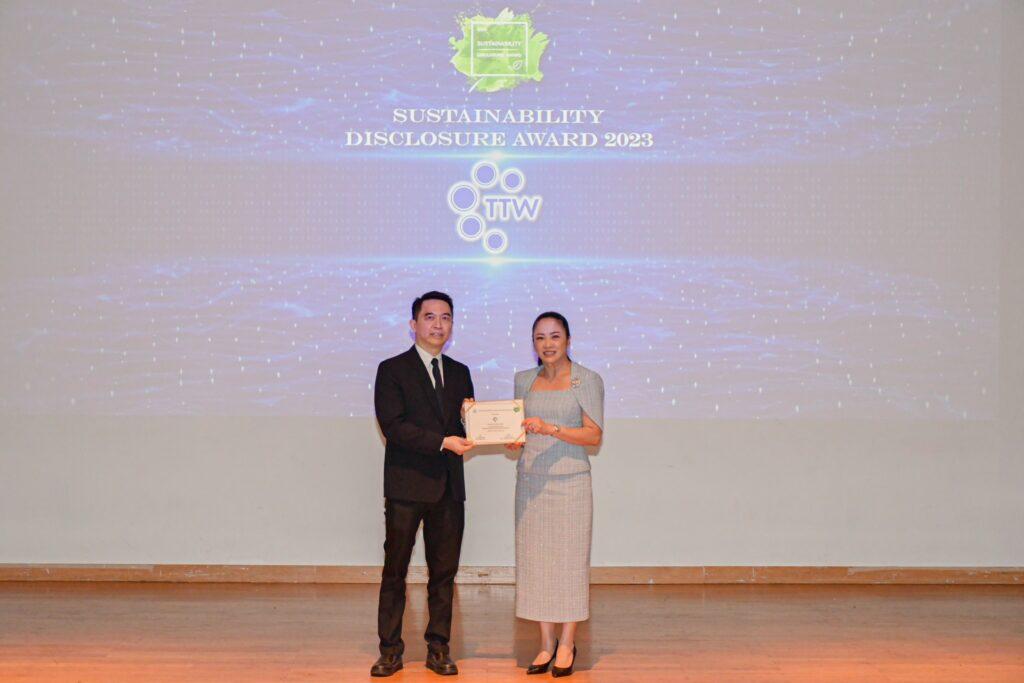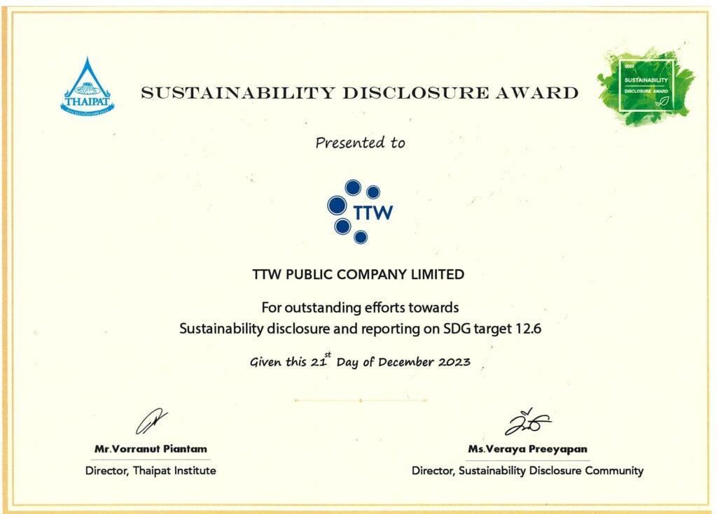 บริษัท ทีทีดับบลิว จำกัด (มหาชน) (TTW) โดย นางสาววลัยณัฐ ตรีวิศวเวทย์ กรรมการผู้จัดการ ได้เป็นตัวแทนขึ้นรับรางวัลเกียรติคุณ “Sustainability Disclosure Award” ประจำปี 2566 ต่อเนื่องเป็นปีที่ 5 จาก ดร.พิพัฒน์ ยอดพฤติการ ประธานสถาบันไทยพัฒน์ ณ ห้องออดิทอเรียม ชั้น 5 หอศิลปกรุงเทพฯ โดยรางวัลนี้พิจารณาจากการประเมินข้อมูลการดำเนินงาน ผ่านรายงานการพัฒนาอย่างยั่งยืนของ TTW ที่นำเสนอข้อมูลด้านความยั่งยืนได้ครบถ้วนสมบูรณ์ และมีความน่าเชื่อถือ ตามกรอบการรายงาน Global Reporting Initiative (GRI) สามารถสะท้อนถึงบทบาทการดำเนินงานขององค์กรต่อการพัฒนาที่ยั่งยืนครบทุกมิติทั้งในด้านสิ่งแวดล้อม สังคม และ ธรรมาภิบาล (Environmental, Social and Governance: ESG) รวมทั้งการพัฒนาองค์กรสู่ความยั่งยืน