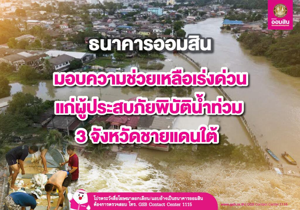นายวิทัย รัตนากร ผู้อำนวยการธนาคารออมสิน เปิดเผยว่า จากสถานการณ์ภัยพิบัติน้ำท่วมที่เกิดขึ้นอยู่ขณะนี้ ใน 3 จังหวัดชายแดนภาคใต้ ยะลา ปัตตานี และนราธิวาส ประชาชนได้รับความเดือดร้อน ครอบคลุมพื้นที่ความเสียหายกว่า 90,000 ไร่ นั้น ธนาคารออมสิน ได้พิจารณาให้ความช่วยเหลือเป็นการเร่งด่วน เพื่อบรรเทาความเดือดร้อนเฉพาะหน้า โดยการสนับสนุนภารกิจของศูนย์ช่วยเหลือผู้ประสบอุทกภัย อำเภอระแงะ จังหวัดนราธิวาส และอำเภอรามัน จังหวัดยะลา มอบสิ่งของช่วยเหลือเบื้องต้น มูลค่ารวม 2,000,000 บาท ได้แก่ ถุงยังชีพ 2,000 ชุด และเครื่องอุปโภคบริโภค สิ่งของเครื่องใช้ที่จำเป็น อาทิ เครื่องนอน เครื่องนุ่งห่ม พัดลม ข้าวสาร และน้ำดื่ม รวมถึงจัดหาอาหาร 3 มื้อแก่ผู้ประสบภัย โดยการมอบความช่วยเหลือเฉพาะหน้าดังกล่าวมีนายเกรียง กัลป์ตินันท์ รัฐมนตรีช่วยว่าการกระทรวงมหาดไทย นายอำพล พงศ์สุวรรณ ผู้ว่าราชการจังหวัดยะลา และนายวิมุตติ อำนักมณี นายอำเภอระแงะ ตัวแทนผู้ว่าราชการจังหวัดนราธิวาส เป็นผู้รับมอบ
