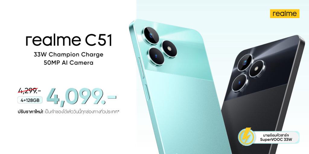 รีบด่วน! เป็นเจ้าของ realme C51 รุ่น 4/128GB ราคาใหม่สุดคุ้ม 4,099 บาทได้แล้ววันนี้ที่ realme Brand Shop ศูนย์จำหน่ายสมาร์ตโฟนชั้นนำทั่วประเทศ และช่องทางออนไลน์ทุกแพลตฟอร์ม ทั้ง Shopee: realme official store, Lazada: realme flagship store และ Tiktok: realme official พบกับโปรโมชันปัง ๆ อีกมากมาย เพียงติดตามเฟซบุ๊ก realme TH https://www.facebook.com/realmeTH