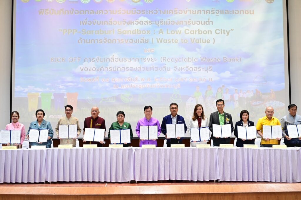 จังหวัดสระบุรี รวมพลัง 18 หน่วยงาน ภาครัฐ องค์กรปกครองส่วนท้องถิ่น ภาคีเครือข่าย และสมาคมอุตสาหกรรมปูนซีเมนต์ไทย (TCMA) ลงนามบันทึกข้อตกลงความร่วมมือเพื่อขับเคลื่อนจังหวัดสระบุรีสู่เมืองคาร์บอนต่ำ ด้านการจัดการของเสีย “PPP-Saraburi Sandbox : Waste to Value” นำร่อง 10 ต้นแบบธนาคารขยะ จุดพลุทุกฝ่ายคัดแยกขยะอย่างถูกวิธี สร้างคุณค่าจากวัสดุเหลือใช้ คว้าโอกาส 3 ต่อ ชุมชนมีรายได้ ลดปริมาณขยะ ลดวิกฤตโลกร้อน ดัน ‘สระบุรีแซนด์บ็อกซ์’ บรรลุผลด้านการจัดการของเสีย