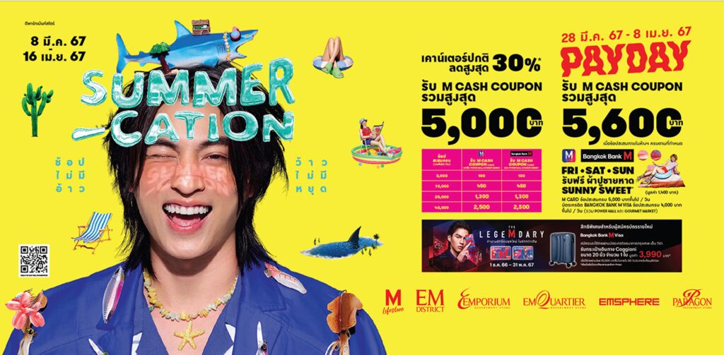 - Tourist Summer Cation เมื่อช้อปสินค้าในห้างฯเอ็มโพเรียม, เอ็มควอเทียร์, เอ็มสเฟียร์ และพารากอน ดีพาร์ทเม้นท์สโตร์ สะสมครบ 20,000 บาท / สาขา /วัน รับคูปองเงินสดมูลค่า 500 บาท และ เมื่อช้อปสินค้าในห้างฯเดอะมอลล์ไลฟ์สโตร์ บางกะปิ สะสมครบ 15,000 บาท / สาขา /วัน รับคูปองเงินสดมูลค่า 500 บาท เพื่อเพื่อต่อยอดการช้อปปิ้ง ในการซื้อถัดไป ตั้งแต่วันนี้ – 31 พ.ค. 2567