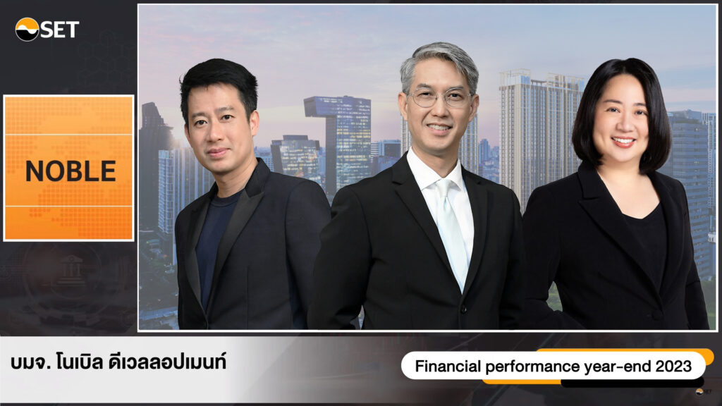 นายศิระ อุดล (กลาง) ประธานเจ้าหน้าที่ปฏิบัติการ กลุ่มธุรกิจอสังหาริมทรัพย์ พร้อมด้วย นายอรรถวิทย์ เฉลิมทรัพยากร (ซ้าย) ประธานเจ้าหน้าที่ปฏิบัติการ กลุ่มธุรกิจใหม่ และนางสาวทิพวรรณ การุณสถิตย์ชัย (ขวา) รักษาการประธานเจ้าหน้าที่บริหารสายงานการเงิน บมจ. โนเบิล ดีเวลลอปเมนท์ (NOBLE) ร่วมนำเสนอข้อมูลสรุปผลประกอบการสำหรับปี 2566 ในงานบริษัทจดทะเบียนพบนักลงทุน (Opportunity Day) ประกาศแผนปี 2567 จ่อเปิดโครงการใหม่ 7 โครงการ มูลค่าโครงการรวมกว่า 22,610 ล้านบาท พร้อมตั้งเป้ารายได้รวมทั้งปีที่ระดับ 14,000 ล้านบาท และยอดขาย (Pre-sales) ไว้ที่ระดับ 20,600 ล้านบาท มุ่งสู่การเป็นบริษัทพัฒนาอสังหาริมทรัพย์ Top 5 ของไทย พร้อมเดินหน้าขยายการลงทุนไปยังธุรกิจใหม่ๆ ภายใต้บริษัท เซิร์ฟ โซลูชั่น จำกัด ในรูปแบบธุรกิจบริหารนิติบุคคล ธุรกิจบริการฝากขาย-ปล่อยเช่า รวมถึงธุรกิจการบริการจัดหาเฟอร์นิเจอร์ เตรียมผลักดันเข้าจดทะเบียนในตลาดหลักทรัพย์แห่งประเทศไทยในอนาคต