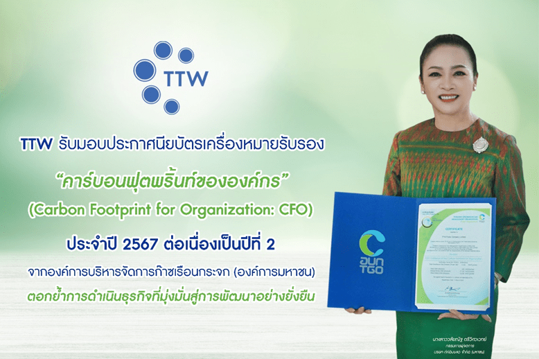 22 มีนาคม 2567 บริษัท ทีทีดับบลิว จำกัด (มหาชน) หรือ TTW ได้รับประกาศนียบัตรการรับรองคาร์บอนฟุตพริ้นท์ขององค์กร (Carbon Footprint for Organization: CFO) โดยองค์การบริหารจัดการก๊าซเรือนกระจก (องค์การมหาชน) ประจำปี 2567 ต่อเนื่องเป็นปีที่ 2 ณ องค์การบริหารจัดการก๊าซเรือนกระจก (องค์การมหาชน) ศูนย์ราชการเฉลิมพระเกียรติฯ
