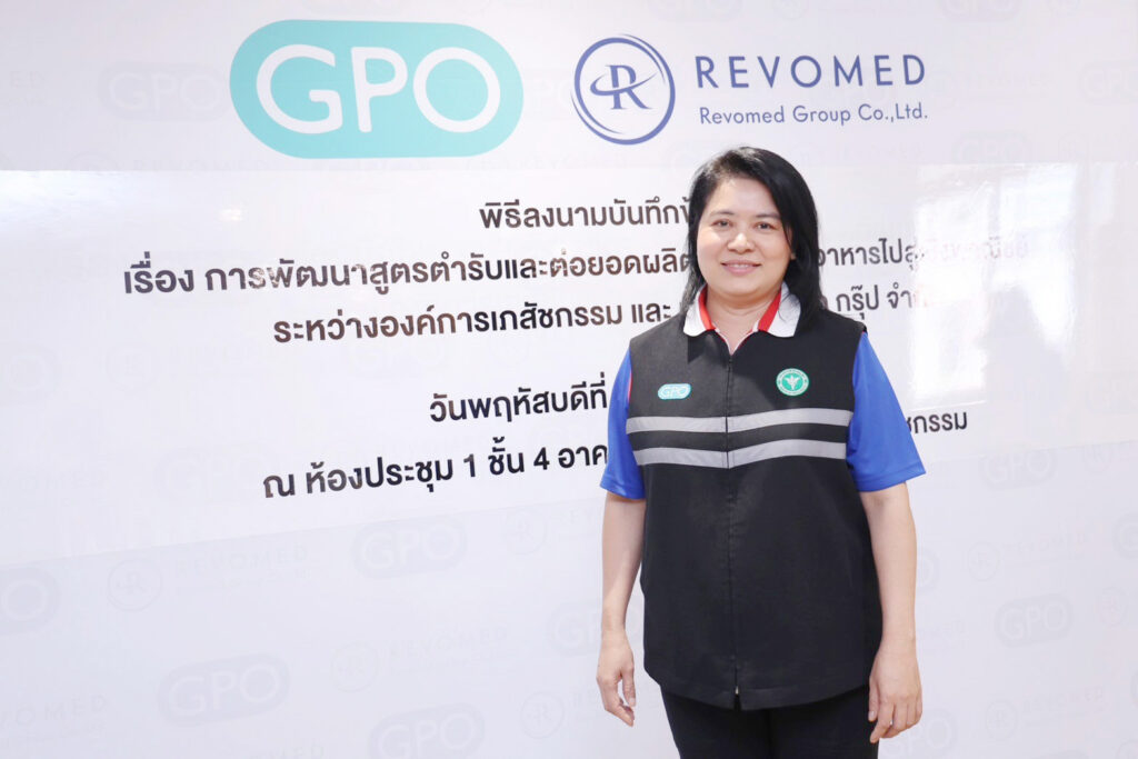 พญ.มิ่งขวัญ สุพรรณพงศ์ ผู้อำนวยการองค์การเภสัชกรรม กล่าวว่า “องค์การเภสัชกรรมมีความเชี่ยวชาญในการวิจัยและพัฒนาทางด้านเภสัชกรรม การผลิตยาและเวชภัณฑ์ที่มีคุณภาพ และมีโรงงานผลิตยาและวัคซีนที่ได้รับมาตรฐานระดับสากล อีกทั้งยังมีการวิจัยและพัฒนายาและเวชภัณฑ์ เพื่อป้องกันรักษาโรคภัยที่เกิดขึ้นใหม่ เพื่อสร้างความมั่นคงด้านสุขภาพ ให้กับคนไทย จากความร่วมมือในครั้งนี้ องค์การเภสัชกรรม มีบทบาทในการคิดค้นและพัฒนาสูตรตำรับผลิตภัณฑ์เสริมอาหาร โดยได้เล็งเห็นความสำคัญของสุขภาพของคนไทย ในการช่วยป้องกันก่อนที่จะเกิดการเจ็บป่วย ภายใต้คอนเซปต์“ป้องกันก่อนรักษา” จึงเกิดความร่วมมือกับ “รีโว่เมด กรุ๊ป” และพร้อมเปิดตัวแบรนด์ GPO+ (จีพีโอ พลัส) เพื่อส่งเสริมดูแลสุขภาพให้กับคนไทย ให้ทุกคนได้ประโยชน์ และหันมาดูแลสุขภาพกันมากขึ้น จากผลิตภัณฑ์คุณภาพที่ตั้งใจผลิตภายใต้มาตรฐานระดับสากล”