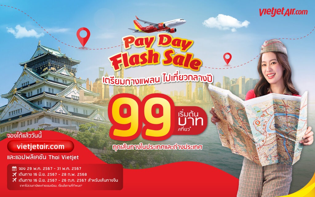สายการบินไทยเวียตเจ็ทลดกระหน่ำ ออกโปรโมชั่น “เตรียมกลางแพลน ไปเที่ยวกลางปี (Pay Day Flash Sale)” เสนอบัตรโดยสารราคาพิเศษ เริ่มต้นเพียง 99 บาท (ราคาไม่รวมภาษีและค่าธรรมเนียม) สำหรับเดินทางบนเครือข่ายเส้นทางบินภายในประเทศและระหว่างประเทศของไทยเวียตเจ็ท สามารถสำรองบัตรโดยสารได้ระหว่างวันที่ 29 – 31 พฤษภาคม 2567 ใช้เดินทางได้ระหว่างวันที่ 16 มิถุนายน 2567 – 28 กุมภาพันธ์ 2568 (ยกเว้นวันหยุดนักขัตฤกษ์) ที่ www.vietjetair.com