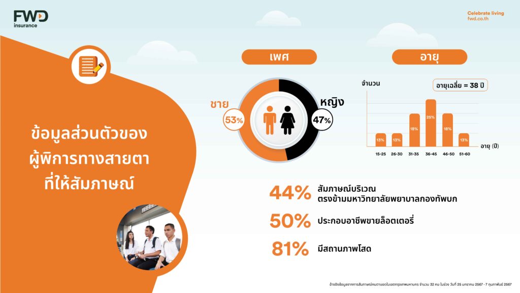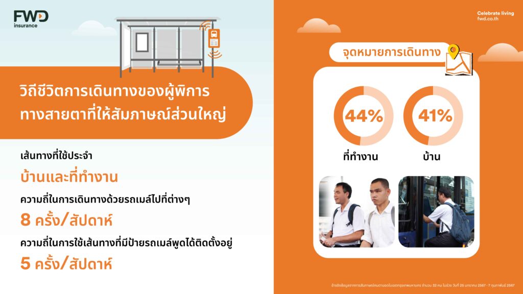 FWD ประกันชีวิต ได้ศึกษาข้อมูลจากรายงานสถานการณ์ด้านคนพิการทางการมองเห็นในประเทศไทย โดยกรมส่งเสริมและพัฒนาคุณภาพชีวิตคนพิการ กระทรวงการพัฒนาสังคมและความมั่นคงของมนุษย์ พบว่า ปัจจุบัน (ข้อมูล ณ วันที่ 31 มีนาคม 2566) ประเทศไทยมีผู้พิการทางสายตา จำนวน 184,622 คน ที่มีการเดินทางเป็นส่วนหนึ่งของชีวิตประจำวัน รวมกับข้อมูลจากการสัมภาษณ์เชิงลึก (in-depth interview) กับผู้พิการทางสายตาภายใต้การดูแลของมูลนิธิช่วยคนตาบอดแห่งประเทศไทย ทำให้เราพบว่า ผู้พิการทางสายตาส่วนใหญ่เลือกใช้การเดินทางประจำวันด้วยรถโดยสารประจำทาง แต่ paint point สำคัญคือ มักจะพลาดรถประจำทางสายที่ต้องการ เนื่องจากไม่สามารถรับรู้ถึงสายรถประจำทางที่ต้องการได้อย่างชัดเจน จนกระทั่งเมื่อแคมเปญได้นำร่องเปิดใช้งานอย่างเป็นทางการ ในช่วงปลายปีที่ผ่านมา บริเวณป้ายรถเมล์ที่ใกล้กับสถานที่ที่ผู้พิการทางสายตาใช้เป็นประจำ จำนวน 10 ป้ายรถเมล์ ครอบคลุมเส้นทางการเดินรถเมล์ 46 สาย ทาง FWD ประกันชีวิต จึงได้ร่วมกับ Homerun Consulting ที่ปรึกษาด้านการทำวิจัย ทำการวิจัยศึกษาอินไซต์และสัมภาษณ์เชิงลึกกลุ่มผู้พิการทางสายตาที่ใช้บริการรถเมล์ ทำให้พบว่า key finding ของ pain point ที่พบก่อนและหลังแคมเปญตรงกัน นอกจากนั้น ยังพบปัญหาสำคัญเพิ่มเติมซึ่งผู้พิการทางสายตาได้เล่าให้เราฟังว่าบางครั้งรถเมล์ที่รอก็เข้าจอดไม่ตรงป้าย ยิ่งเวลาที่ไม่มีผู้โดยสารคนอื่นยืนรออยู่ด้วย ก็จะทำให้รถเมล์ไม่ได้เข้ามาจอด หรือในบางครั้งผู้พิการทางสายตาก็ไม่สามารถสอบถามหรือขอความช่วยเหลือจากใครได้ ดังนั้น การมีระบบเสียงอัจฉริยะที่ป้ายรถเมล์ ก็เป็นอีกหนึ่งตัวช่วยที่ดี เพื่อเตือนให้ผู้พิการทางสายตาทราบถึงรถโดยสารที่กำลังจะมา และเตรียมตัวเดินทาง
