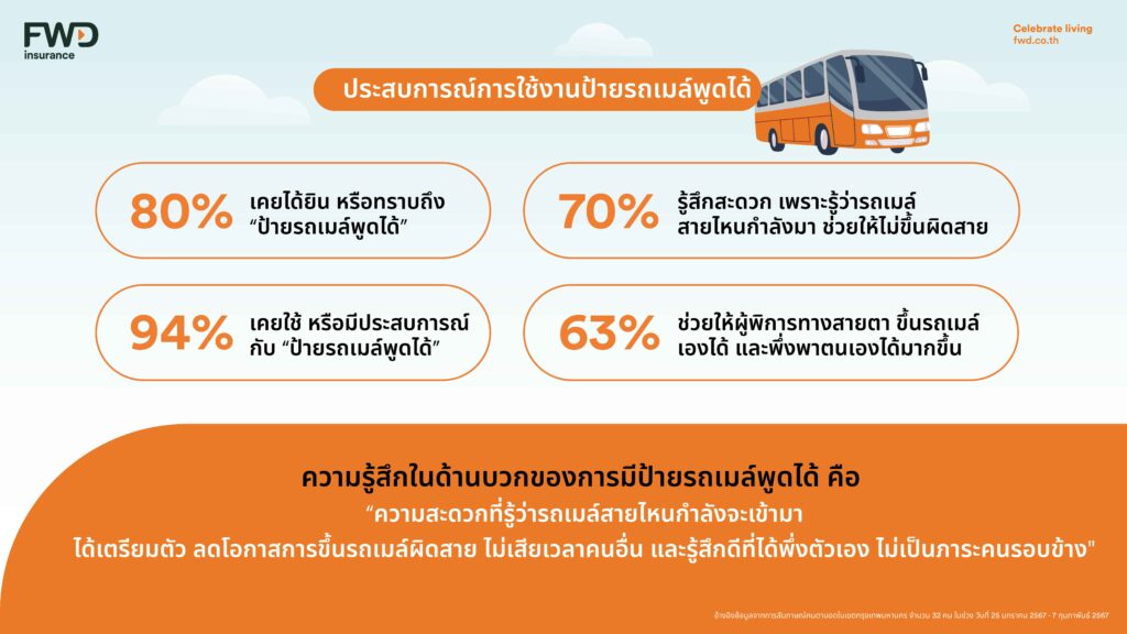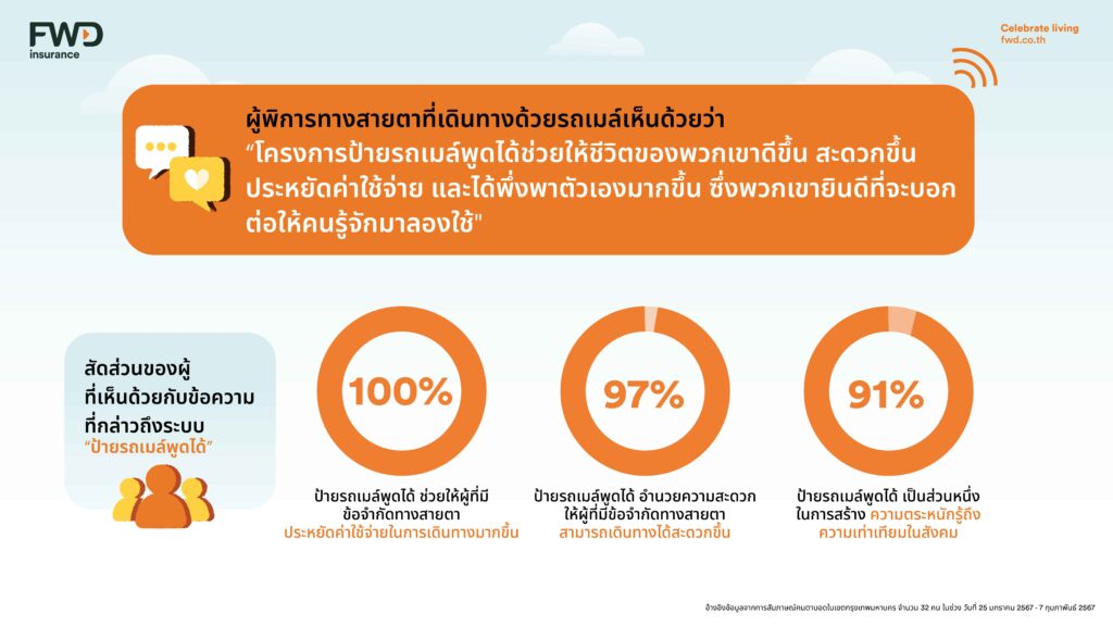 “บทสรุปจากผลวิจัยแคมเปญ “The Talkable Bus Shelter ป้ายรถเมล์พูดได้” คือ การเดินถูกทางในการที่จะช่วยยกระดับความเท่าเทียม นอกเหนือจากการสร้างความตระหนักรู้ เรายังได้ลงมือทำให้เห็นเป็นรูปธรรมอย่างจริงจัง พร้อมทั้งการได้ลงพื้นที่สำรวจ feedback ทำให้ได้ learning เพิ่มเติมเพื่อนำมาพัฒนาต่อได้ FWD ประกันชีวิต ในฐานะองค์กรที่สนับสนุนด้านความหลากหลาย ความเท่าเทียม และเคารพทุกความแตกต่างกันในสังคม รู้สึกภูมิใจที่แคมเปญของเราได้เป็นส่วนหนึ่งของการแก้ปัญหา pain point ในเรื่องการเดินทางโดยรถสาธารณะของกลุ่มผู้พิการทางสายตา ซึ่งนับว่าเป็นอีกโครงการที่เป็นประโยชน์ต่อสังคม อีกทั้งยังช่วยยกระดับและพัฒนาคุณภาพชีวิตของผู้พิการทางสายตาในด้านการเดินทางให้สามารถใช้ชีวิตประจำวันได้ง่ายขึ้น โดยเรายังคงมุ่งมั่นที่จะลดความเหลื่อมล้ำ และสร้างประโยชน์ให้สังคมอย่างต่อเนื่อง ตามเป้าหมายของ FWD ที่สนับสนุนให้ผู้คนในสังคมไทยได้ใช้ชีวิตอย่างเต็มที่แบบไม่ต้องกังวล” ปวริศา ชุมวิกรานต์ ประธานเจ้าหน้าที่สายงานการตลาด บริษัท เอฟดับบลิวดี ประกันชีวิต จำกัด (มหาชน) หรือ FWD ประกันชีวิต กล่าว