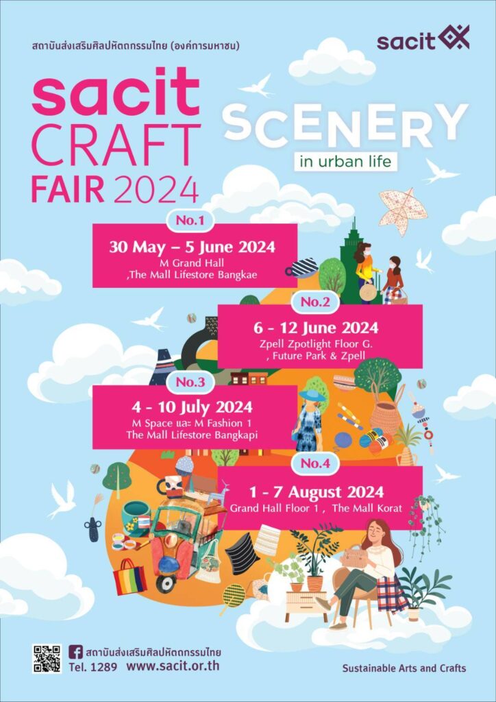 งาน “SACIT CRAFT FAIR 2024” จัดขึ้นเพื่อนำเสนอผลิตภัณฑ์หัตถศิลป์ไทย งานคราฟต์รุ่นใหม่ใส่ดีไซน์ จากกลุ่มสมาชิกผู้ผลิตผลงานให้เป็นที่รู้จักในวงกว้าง โดยสถาบันส่งเสริมศิลปหัตถกรรมไทย (องค์การมหาชน) หรือ SACIT เพื่อเป็นการขยายโอกาสทางการตลาดให้แก่ผู้สร้างงานหัตถกรรมไทย เช่น งานผ้า เครื่องจักสาน เครื่องประดับ เครื่องปั้นดินเผา เครื่องหนัง เครื่องใช้ของตกแต่งบ้าน พร้อมให้อุดหนุนงานคราฟต์ฝีมือคนไทย ให้ประเทศไทยเป็นมหานครแห่ง Craft Power และยังมีกิจกรรมความบันเทิงจากศิลปินมากมายมาย พบกับมินิคอนเสิร์ตจากศิลปินดารา