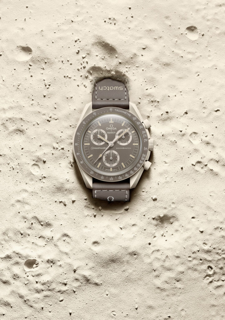 หน้าปัด: สีเทาเบจ (สีโทป) มีโลโก้ OMEGA X Swatch โลโก้ Speedmaster และ MoonSwatch อันเป็นเอกลักษณ์ รวมถึงหน้าปัดย่อยแบบเว้า พร้อมเข็มและวงแหวนตรงหน้าปัดสีเม็ดทราย ตัวเลขอารบิกและขีดบอกเวลาตรงหน้าปัดย่อยแบบแผ่กระจาย ซึ่งเป็นการคารวะนาฬิกา Speedmaster รุ่น Alaska II และ III ของ OMEGA หลักชั่วโมงเคลือบสารเรืองแสง Super-LumiNova® เกรด A (เปล่งแสงสีเขียว)
