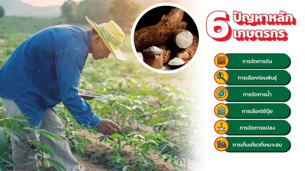 นอกจากนี้ ยังพบ 6 ปัญหาหลักที่เกษตรกรมันสำปะหลังพบเจอ ได้แก่ 1) การจัดการดิน 2) การเลือกท่อนพันธุ์ 3) การจัดการน้ำ 4) การเลือกใช้ปุ๋ย 5) การจัดการแปลง 6) การเก็บเกี่ยวที่เหมาะสม โดยการจัดการท่อนพันธุ์มันสำปะหลังถือเป็นสิ่งสำคัญที่สุด เนื่องจากต้องเลือกท่อนพันธุ์มันสะอาด ปราศจากโรค มีคุณภาพ และเหมาะสมกับดิน หากกระบวนการจัดการต่าง ๆ ไม่เหมาะสม จะส่งผลให้ผลผลิตต่ำลงและไม่มีคุณภาพเพียงพอ สำหรับไร่กาแฟเผชิญปัญหาเรื่องการจัดการน้ำ ปุ๋ย ดิน และการจัดการมอด ส่งผลต่อรสชาติและผลผลิตลดลง